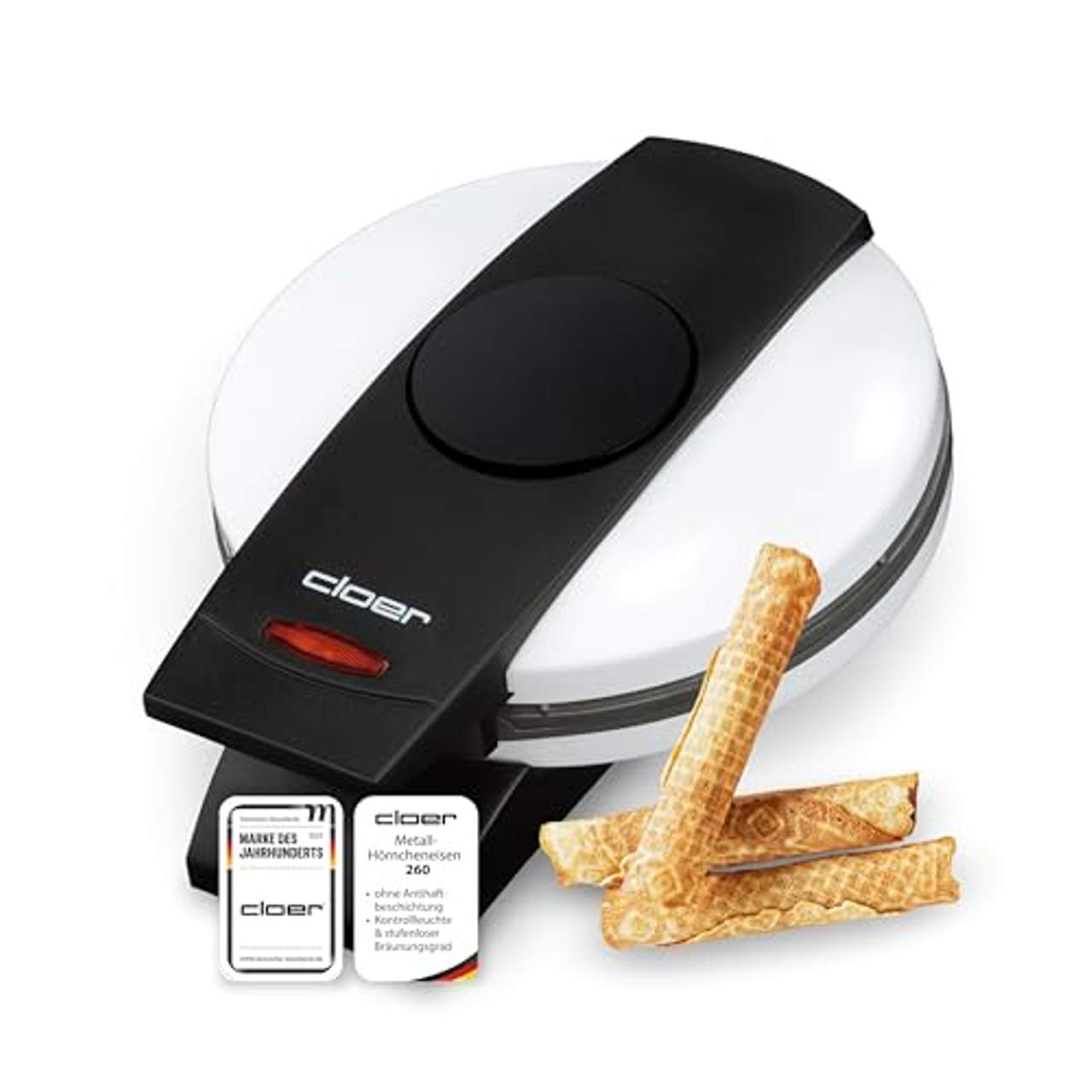 Cloer 260 HörncheneisenMit dem Hörnchenautomat Cloer 260 lassen sich hauchdünne, knusprige Waffelhörnchen herstellen, um leckeres Eis wie in der Eisdiele zu genießen. Der festeingestellt Bräunungsgrad erzielt beim Backen eine gleimäßige Bräune und eine optische Fertigmeldung gibt Auskunft darüber, ob die Hörnchen fertig gebacken sind.Ein innenliegendes Scharnier und die Fettauffangrille vereinfachen die Reinigung des Gerätes. Der Hörnchenautomat 260 lässt sich dank Kabelaufwicklung mit Steckerdepot und durch Hinstellen auf die Griffe platzsparend verstauen.