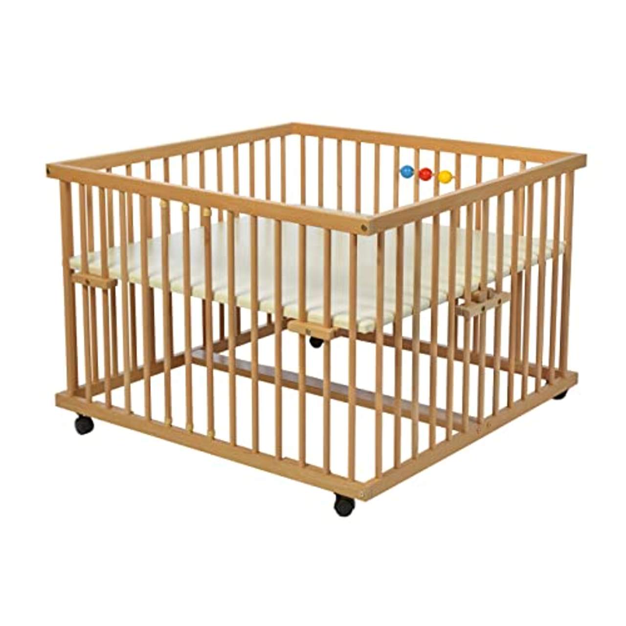 Zusätzliche Funktionen erhöhen die Benutzerfreundlichkeit und den Wert eines Holzlaufgitters erheblich. Das „Kidsmax Laufgitter David 120x120 Buche klar lackiert“ ist mit mehreren bemerkenswerten Eigenschaften ausgestattet: einem stufenlos höhenverstellbaren Polsterboden, drei bunten Kugeln aus Holz, vier Rollen und Schlupfsprossen. Diese Elemente sorgen zusammen für Unterhaltung und Funktionalität.