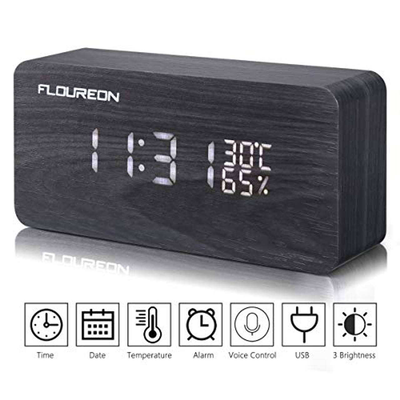 1 x FLOUREON Holzuhr LED Digitale Wecker (Schwarz)