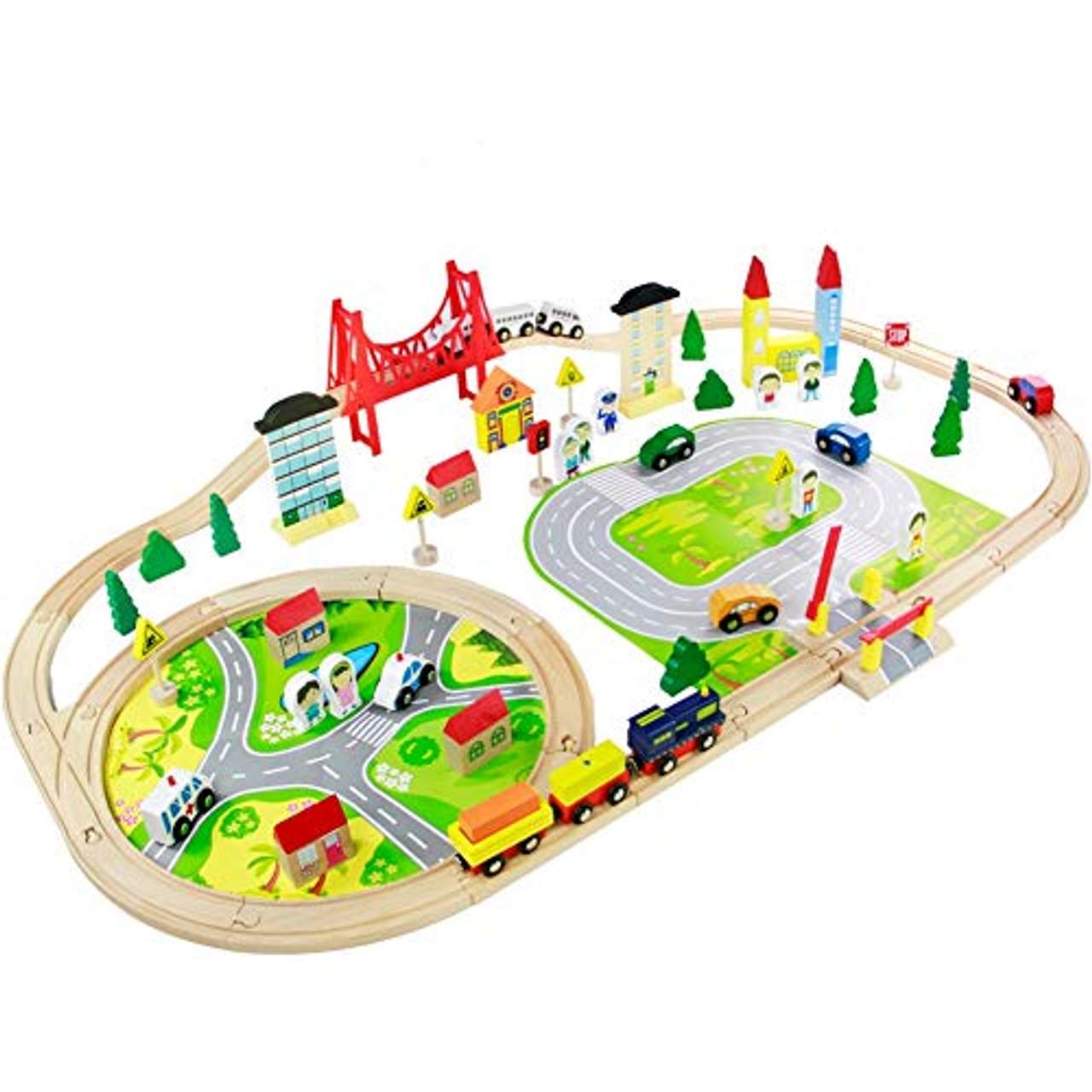 Holzeisenbahn mit 82 Accessoires, mit denen Sie Ihre Kinder beschäftigen und ihre Geduld beim stundenlangen Spielen verbessern können