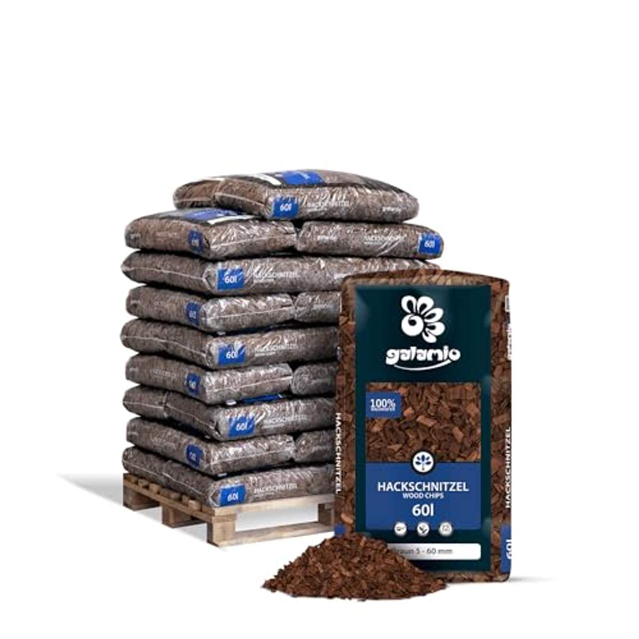 GALAMIO Holzhackschnitzel Brau Hackschnitzel Mulch Natur WaldUnsere braunen Holzhackschnitzel der Marke GALAMIO mit der Körnung 5-60 mm bringen starke Kontraste in Ihren Garten und setzen Beete sowie Wege perfekt in Szene. Mit den farbigen Holzhackschnitzeln gestalten Sie Ihre Außenflächen ganz individuell und lebendig.Hergestellt aus reinem Kiefernholz und gefärbt mit natürlichen Eisenoxiden sind sie unbedenklich für Umwelt und Boden – bringen Sie Farbe in den Garten, ohne der Natur zu schaden. Nach dem Auslegen bieten die Hackschnitzel bis zu drei Jahre lang ansprechende Optik und funktionalen Schutz für Ihre Gartenflächen. Sie helfen, den Boden vor starken Temperaturschwankungen zu schützen und reduzieren das Unkrautwachstum, wodurch sich der Pflegeaufwand verringert.Durch die Feuchtigkeitsspeicherung im Boden wird weniger Gießen erforderlich, und die Bodenstruktur bleibt geschützt. Besonders in warmen Monaten sorgen die Hackschnitzel dafür, dass die Pflanzen besser mit Wasser versorgt bleiben. Für eine kreative Gartengestaltung lassen sich die Holzhackschnitzel gut mit anderen Farben kombinieren und eignen sich ideal für Pflanztöpfe oder zwischen Sträuchern – ein echter Hingucker in Ihrem Garten! Setzen Sie Kontraste oder kreieren Sie Muster und Formen nach Ihren persönlichen Vorstellungen. Bestellen Sie die GALAMIO Holzhackschnitzel ganz bequem und erhalten Sie die Ware direkt nach Hause geliefert.Die Lieferung erfolgt in praktischen 60-Liter-Säcken, die ordentlich auf einer Palette gestapelt sind und per Spedition zuverlässig ankommen. Je nach Bedarf können Sie zwischen 13, 26 oder 39 Säcken pro Palette wählen.