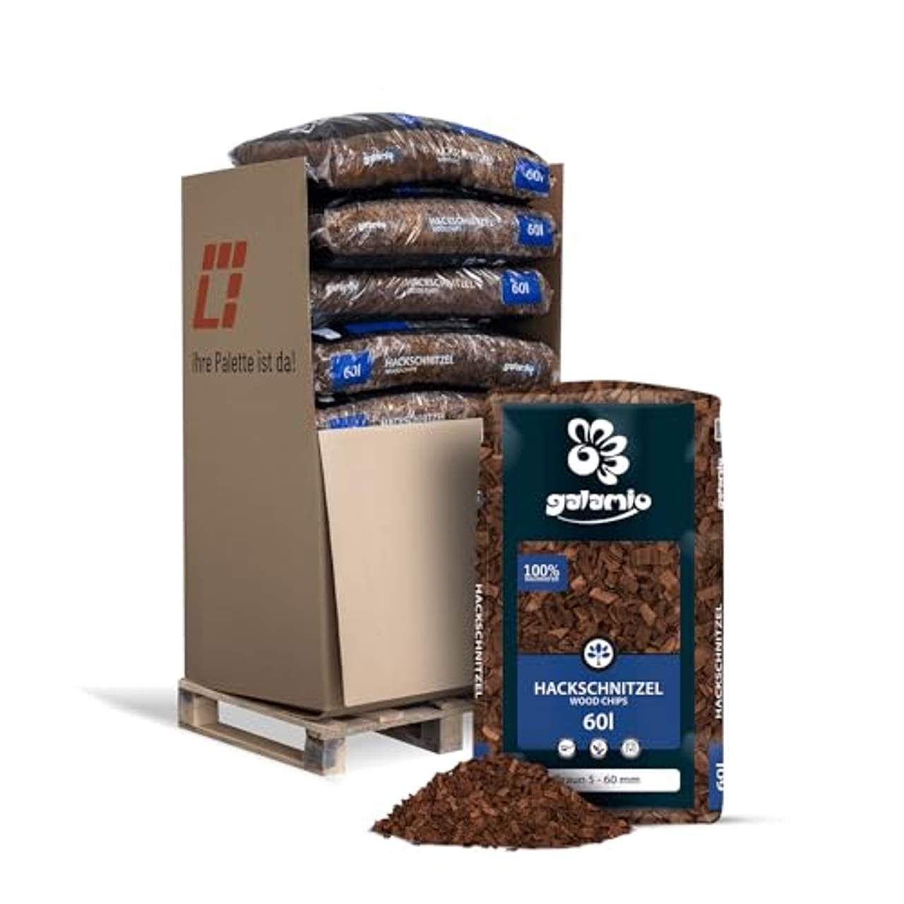 Du kannst GALAMIO Holzhackschnitzel Braun Hackschnitzel Mulch Natur Wald in praktischen 60-Liter-Säcken kaufen. Bei der Bestellung hast du die Möglichkeit, aus verschiedenen Palettengrößen zu wählen: 13, 26 oder 39 Säcke pro Palette, je nach deinen spezifischen Projektanforderungen.