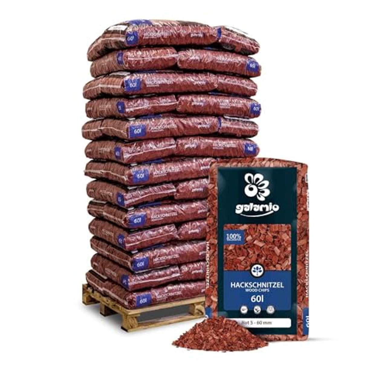 GALAMIO Holzhackschnitzel Rot Hackschnitzel Mulch Natur Wald KieferUnsere roten Holzhackschnitzel der Marke GALAMIO mit der Körnung 5-60 mm bringen starke Kontraste in Ihren Garten und setzen Beete sowie Wege perfekt in Szene. Mit den farbigen Holzhackschnitzeln gestalten Sie Ihre Außenflächen ganz individuell und lebendig.Hergestellt aus reinem Kiefernholz und gefärbt mit natürlichen Eisenoxiden sind sie unbedenklich für Umwelt und Boden – bringen Sie Farbe in den Garten, ohne der Natur zu schaden. Nach dem Auslegen bieten die Hackschnitzel bis zu drei Jahre lang ansprechende Optik und funktionalen Schutz für Ihre Gartenflächen. Sie helfen, den Boden vor starken Temperaturschwankungen zu schützen und reduzieren das Unkrautwachstum, wodurch sich der Pflegeaufwand verringert.Durch die Feuchtigkeitsspeicherung im Boden wird weniger Gießen erforderlich, und die Bodenstruktur bleibt geschützt. Besonders in warmen Monaten sorgen die Hackschnitzel dafür, dass die Pflanzen besser mit Wasser versorgt bleiben. Für eine kreative Gartengestaltung lassen sich die Holzhackschnitzel gut mit anderen Farben kombinieren und eignen sich ideal für Pflanztöpfe oder zwischen Sträuchern – ein echter Hingucker in Ihrem Garten! Setzen Sie Kontraste oder kreieren Sie Muster und Formen nach Ihren persönlichen Vorstellungen. Bestellen Sie die GALAMIO Holzhackschnitzel ganz bequem und erhalten Sie die Ware direkt nach Hause geliefert.Die Lieferung erfolgt in praktischen 60-Liter-Säcken, die ordentlich auf einer Palette gestapelt sind und per Spedition zuverlässig ankommen. Je nach Bedarf können Sie zwischen 13, 26 oder 39 Säcken pro Palette wählen.