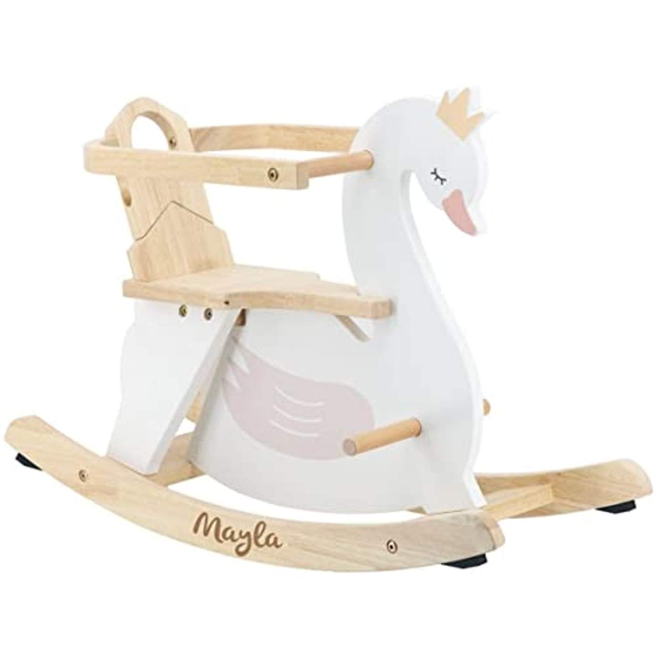 - Süßes Design: Das süße Design des Schwan-Schaukelpferdes in Kombination mit einer dezenten Farbgebung verleiht jedem Kinderzimmer eine ästhetische Note. Sein charmantes Aussehen macht es zu einem echten Hingucker, der von kleinen Besuchern und Erwachsenen gleichermaßen bewundert wird. Das durchdachte Design sorgt dafür, dass das personalisierte Schaukelpferd nicht nur ein hübsches Dekorationsstück ist, sondern auch für endlose Unterhaltung für Kinder sorgt.
