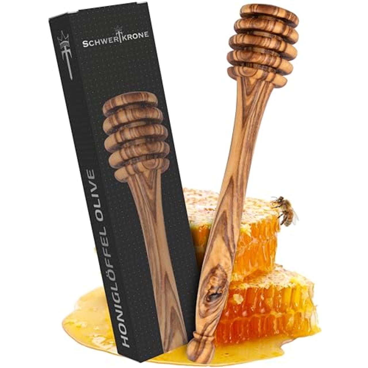 Der Schwertkrone Honiglöffel ist aus hochwertigem Olivenholz gefertigt, das deinen Küchenutensilien einen natürlichen und einzigartigen Touch verleiht. Es hat ein ausgeprägtes Maserungsmuster, das jeden Löffel zu einem echten Unikat macht.