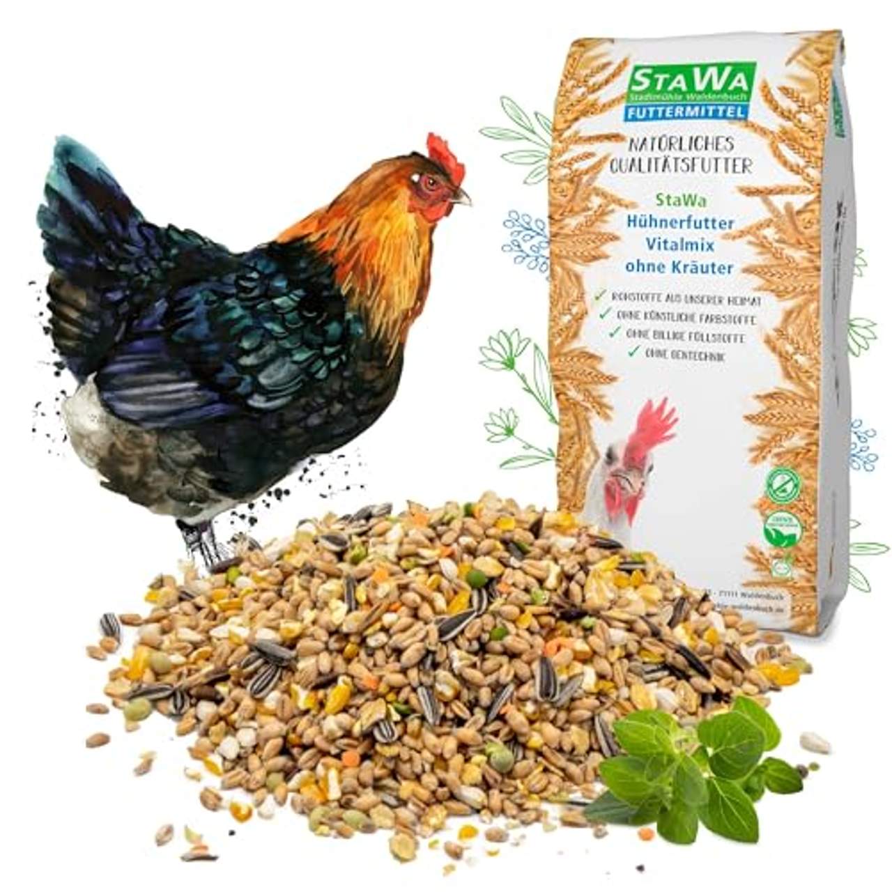StaWa VitalMix Hühnerfutter Geflügelkörnerfutter ist frei von gentechnisch veränderten Organismen (GVO) und enthält keine künstlichen Konservierungs- oder Farbstoffe. Es ist eine natürliche und gesündere Option für deine Hühner.