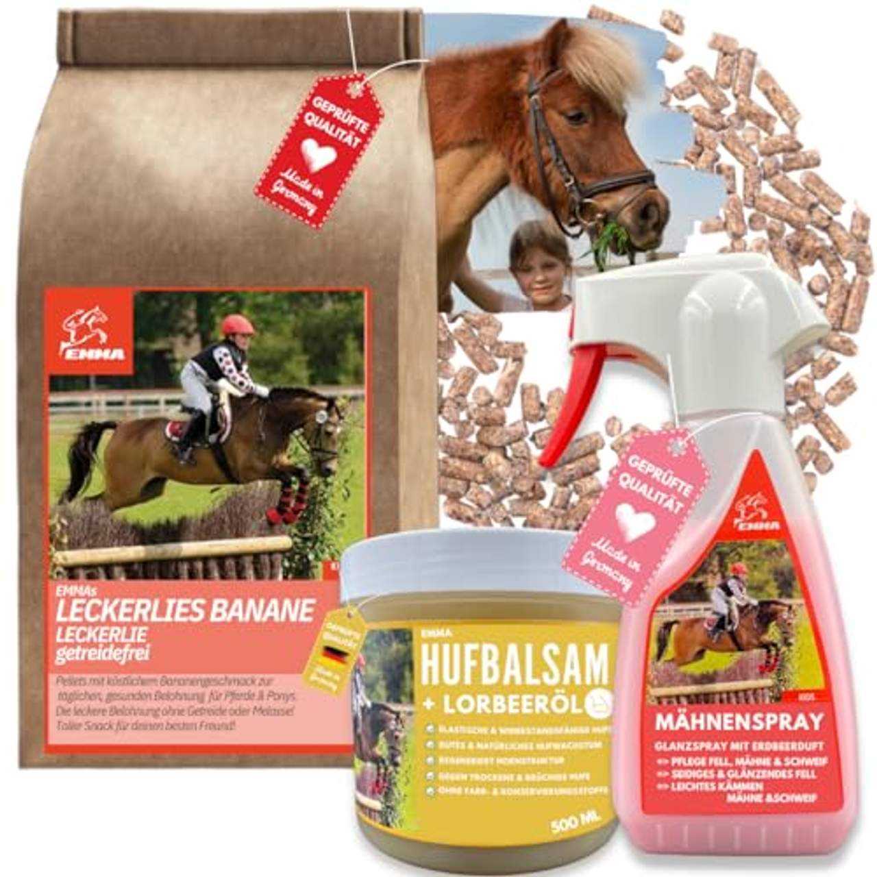 - All-in-One Pferdepflege: Das EMMA Glitzerspray Pferde I Glitzer Huffett I Pferdeleckerlis bietet ein komplettes Pferdepflege-Set in einem Paket. Es enthält Pflegeutensilien, Glitzermähnenspray, Huffett und Pferdeleckerlis, damit die Pferde die volle Pflege bekommen, die sie brauchen.