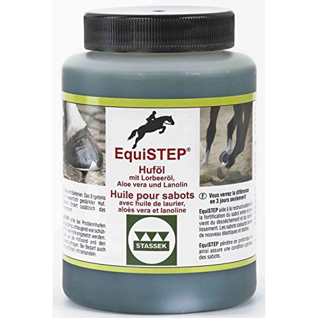 Riding Equistep HufölHuföl mit Lorbeeröl, Aloe Vera und Lanolin. Bereits nach 3 Tagen sichtbarer Erfolg! EquiSTEP pflegt, schützt, regeneriert und stärkt, fördert das Hufwachstum. Bereits nach dreitägiger Anwendung werden spröde Hufe wieder elastisch und stabil. EquiSTEP spendet dem Huf Feuchtigkeit und festigt das Horn. Lorbeeröl fördert zusätzlich das Hufwachstum.EquiSTEP hilft bei regelmäßiger Anwendung Hufprobleme wie Ausbrechen der Hufe, schlecht haltenden Eisen oder aber auch Fäulnisprozesse zu beseitigen und vorzubeugen. Die exzellenten Pflegewirkstoffe versorgen das Hufhorn nachhaltig mit natürlichen Aminosäuren und wertvollen Mineralstoffen.EquiSTEP dringt bis in die unteren Hornschichten ein ohne die Hornporen zu versiegeln.Das Horn behält seine Atmungsaktivität und erhält eine natürliche Barrierefunktion gegen schädliche Einflüsse und Bakterien. Das Ergebnis ist ein wesentlich besser gestärkter Huf. Daher ist EquiSTEP sowohl für zu harte und trockene Hufe, als auch für zu weiche Hufe die