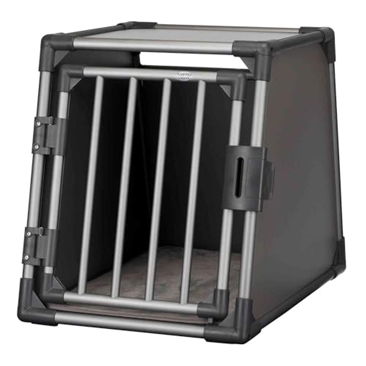 Trixie 39336 Transportbox AluminiumDie Hunde-Transportbox mit einem Aluminiumrahmen von TRIXIE ist eine stabile Hundebox und das ideale Transportmittel, um Ihr Tier bequem und sicher zu transportieren. Dank der schrägen Vorder- und Rückfront können Sie sie in den Kofferraum oder auf den Rücksitz stellen, mit den Klettverschlüssen und Anschnallgurten am Boden sichern und Ihr Tier äußerst sicher transportieren.Die hohen, geschlossenen Wände sorgen nicht nur dafür, dass Ihr Kofferraum sauber bleibt, sondern reduzieren idealerweise auch äußere Reize oder Geräusche. Durch die stabile Tür mit Sicherheitsverriegelung ist Ihr Haustier sicher und geschützt. Um Ihren pelzigen Freund komfortabel zu transportieren, ist im Lieferumfang eine rutschfeste Thermomatte enthalten, welche in der Waschmaschine bei bis zu 30 °C gewaschen werden kann.Spezifikationen: Farbe: Graphitgrau Material: Aluminium und Kunststoff Abmessungen: 55 x 61 x 74 cm (B x T x H) Größe: M Tür mit Sicherheitsverriegelung Inklusive Sichtfenster an der Rückwand