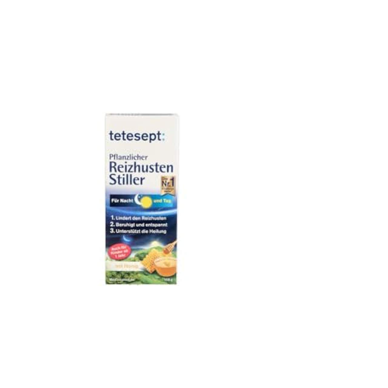 tetesept Pflanzlicher Reizhusten Stillertetesept: Pflanzlicher Reizhusten Stiller tetesept Pflanzlicher Reizhusten Stiller zur Linderung von Reizhusten. Beruhigt und entspannt. Für Tag und Nacht Mit Honig Lindert den Reizhusten Beruhigt und entspannt Unterstützt die Heilung tetesept Pflanzlicher Reizhusten Stiller lindert unangenehmen trockenen Husten und beruhigt den Hustenreiz.Der pflanzliche Reizhusten Stiller zieht seine reizlindernde und befeuchtende Wirkung aus dem Extrakt von Isländisch Moos. Dieser bewährte, natürliche Wirkstoff legt sich auf die Schleimhaut in Hals und Rachen und befeuchtet dort die gereizten Stellen, wodurch diese beruhigt werden.Der Hustenreiz lässt so spürbar nach. Der natürliche Heilungsprozess wird gefördert. tetesept Pflanzlicher Reizhusten Stiller ist auch für abends und nachts gut geeignet. Durch seine reizlindernde Wirkung sorgt er für eine ruhige Nacht. tetesept Pflanzlicher Reizhusten Stiller ist natürlich wirksam bei Reizhusten:Lindert den Reizhusten. Beruhigt und entspannt. Unterstützt die Heilung. tetesept Pflanzlicher Reizhusten Stiller – Für Nacht und Tag. tetesept Pflanzlicher Reizhusten Stiller enthält Isländisch Moos und Honig und ist für Kinder ab 1 Jahr geeignet. Anwendung tetesept Pflanzlicher Reizhusten Stiller zur optimalen Benetzung der Mund- und Rachenschleimhaut ca. 30 Sekunden im Mund zergehen lassen und anschließend schlucken. Für Erwachsene und Kinder ab 1 Jahr: Erwachsene nehmen 3 mal täglich 10 ml Jugendliche zwischen 15–18 Jahren bis zu 5 mal täglich 5 ml , Jugendliche zwischen 11-14 Jahren bis zu 3 mal täglich 5 ml, Kinder zwischen 4-10 Jahren bis zu 2 mal täglich 5ml und Kinder von 1–3 Jahren 1 mal täglich 5 ml ein. Zusammesetzung Isländisch Moos Extrakt (enthält Glycerin), Honig, Bitter Fenchelöl, Sternanisöl, Zuckercouleur, Glucosesirup, Saccharoseacetatisobutyrat (enthält Triglyceride), Kaliumcitrat, Kaliumsorbat, Wasser. Enthält: Isländisch Moos, Honig, Kaliumsorbat und Kaliumcitrat, Glucose. Frei von: Gluten, Lactose