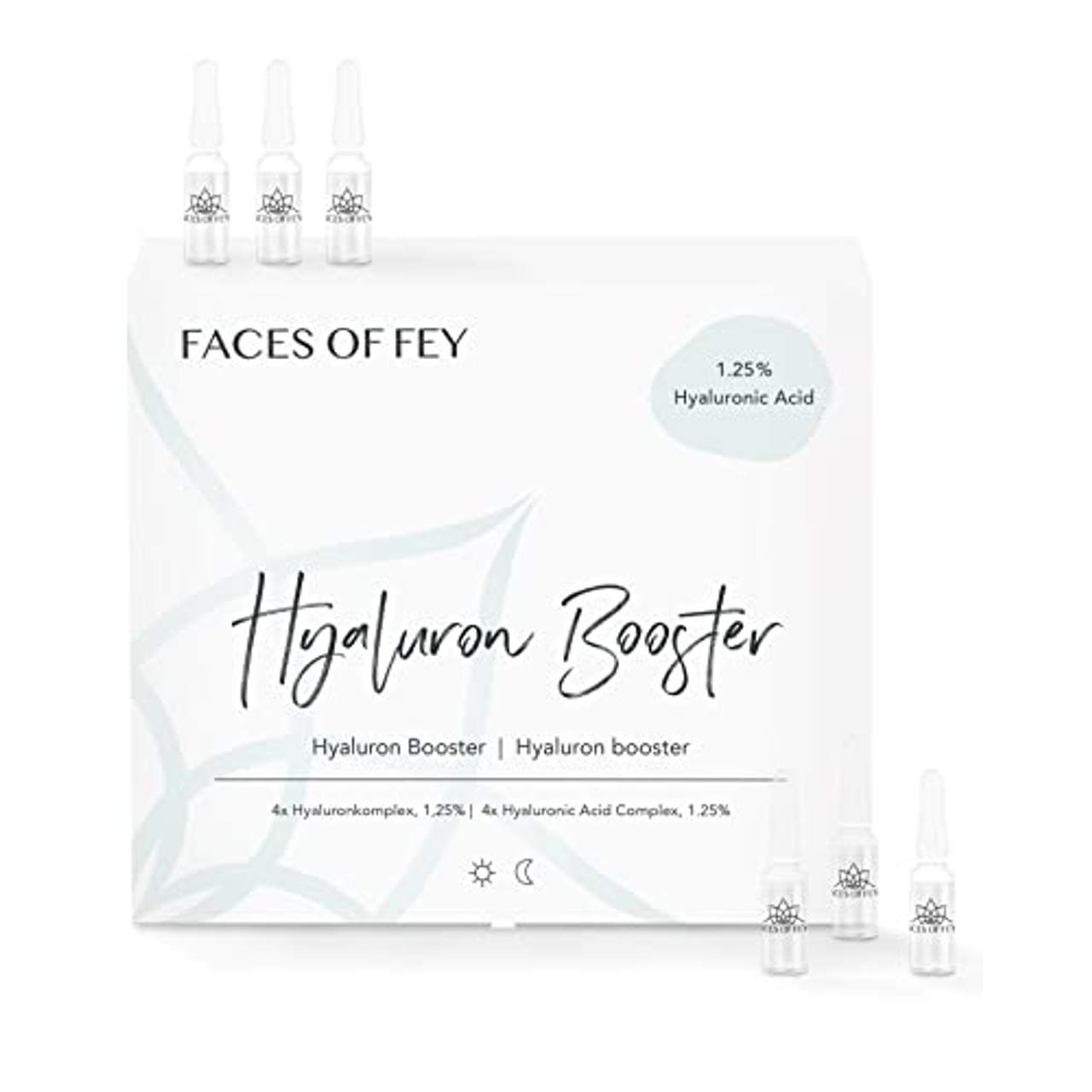 FACES OF FEY Dermaroller AmpullenGrundpreis: 1.50 / 1.0 pieces | Ampullen Hyaluron Booster Hyaluron bzw. Hyaluronsäure ist ein intensiver Feuchtigkeitsspender, der Mimik- und Trockenheitsfältchen mindert. In unseren Boostern sind ganze 1,25% Hyaluron enthalten um Deine Haut optimal mit Feuchtigkeit zu versorgen. Der hochkonzentrierte 4-Fach Komplex aus hoch-, mittel-, niedermolekularer und Oligohyaluronsäure kann die Haut neben dem spürbaren Soforteffekt auch langanhaltend aufpolstern. Durch die Anwendung werden kleinere Fältchen und Trockenheitsfältchen sofort straffer und weniger sichtbar, trockene Stellen werden wieder geschmeidig und die Haut wirkt ebenmäßig und fein.Die Booster wurden speziell für die Anwendung mit Ultraschall und Microneedling entwickelt und eigenen sich auch einzeln angewendet ideal als 30-Tage Intensivkur. Dermatologisch getestet und als „sehr gut“ ausgezeichnet. Die Booster versorgen die Haut mit extra viel Feuchtigkeit und verbessern spürbar die Spannkraft Der enthaltende 4-fach Hyaluronkomplex sorgt für eine glatte, pralle Haut mit gesunder Frische 30 hochwertige Glasampullen plus Ampullenbrecher aus Recycling-Kunststoff