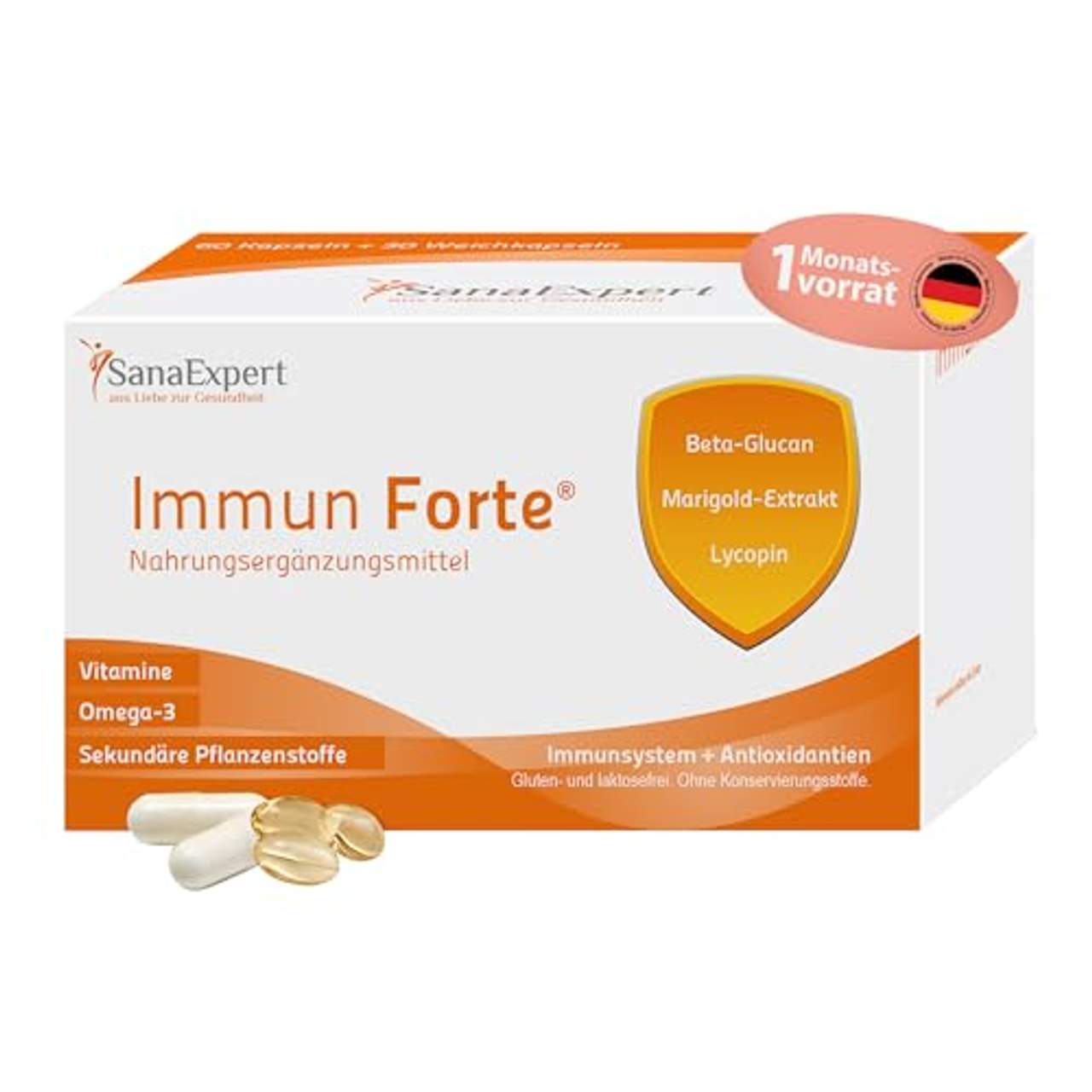 - Omega-3-Fettsäuren: SanaExpert Immune Forte ist reich an ungesättigten Omega-3-Fettsäuren und Vitamin E, die zum Schutz der Zellen vor oxidativem Stress beitragen. Sowohl DHA als auch EPA (Omega-3-Fettsäuren) tragen zu einer normalen Herzfunktion bei. Es enthält außerdem ß-Glucan und ist reich an Lutein und Lycopin, die für die allgemeine Gesundheit wichtig sind.