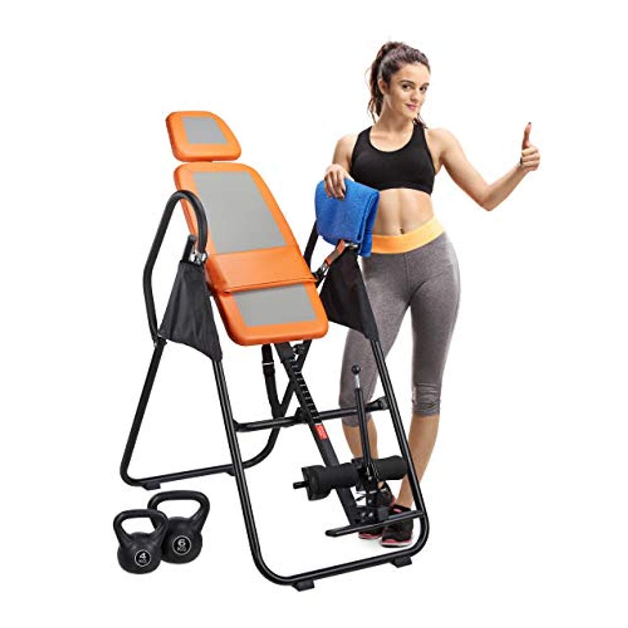 Die Inversionsbank ist in einem auffälligen Orange gehalten und kann mit bis zu 130 kg belastet werden. Damit ist sie für Personen mit einer Körpergröße von bis zu 180 cm geeignet.