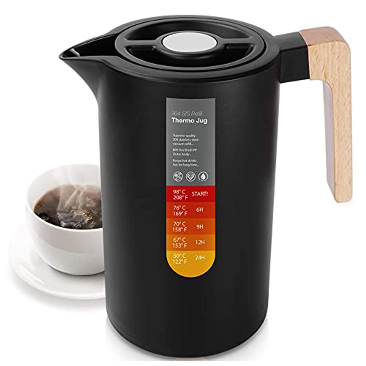 Die Isolierkanne hat ein schlichtes, aber modisches Design mit einer mattschwarzen/weißen Außenlackierung und einem Holzgriff, der einen ästhetischen Wert darstellt und sich perfekt für zu Hause, das Büro oder auf Reisen eignet.
