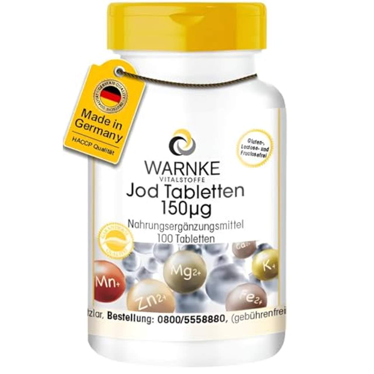Jede Tablette WARNKE VITALSTOFFE Jod Tabletten enthält 150 µg Jod, das für die Aufrechterhaltung der Schilddrüsenfunktion und der allgemeinen Gesundheit wichtig ist.