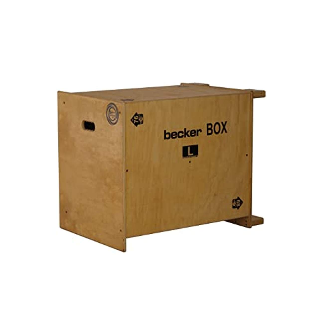 Becker-Sport Germany Becker Box L Weltneuheit ist eine neue Plyobox, die auf jeder Seite zwei Sprunghöhen bietet. Sie ist in den Standardmaßen 20x24x30 Zoll und 18x22x27 Zoll erhältlich, wobei die Maße sowohl in Zoll als auch in cm angegeben sind. Die Box hat stark gefräste Kanten und Ecken, ist aus hochwertigem, mehrfach verstärktem Holz gefertigt und kann bis zu 300 kg tragen. Sie hat außerdem geschliffene Bretter und ist mit einem matten Klarlack versiegelt.