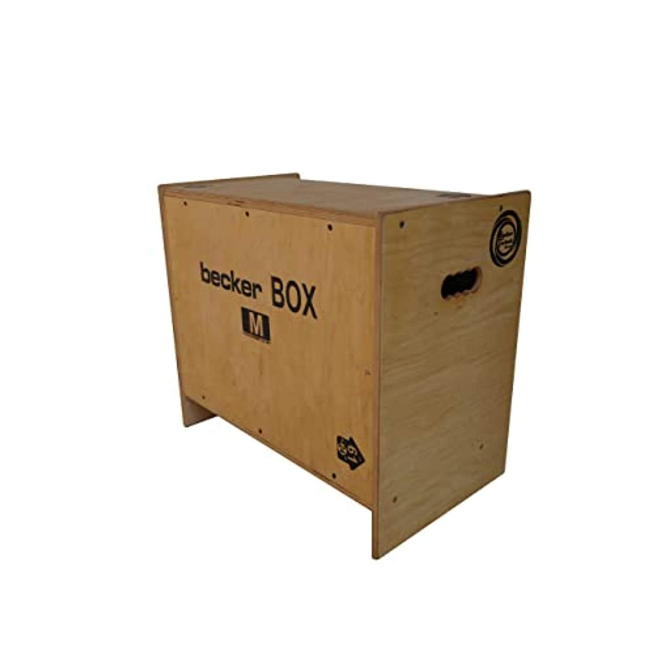 Die Becker-Sport Germany Becker Box M Weltneuheit ist eine neue zweiseitige Sprungbox mit 2 verschiedenen Sprunghöhen von 12, 15, 18, 21 und 24 Zoll (30, 38, 45, 53 und 61 cm). Er kann ein Gewicht von bis zu 250 kg tragen. Er ist aus hochwertigem Furnierholz gefertigt und die Kanten sind mit einer großen weichen Rundung gefräst. Außerdem ist er zum Schutz mit einer matten Klarlackbeschichtung versehen. Die niedrige Grundhöhe von 30 cm und die maximale Höhe von 61 cm machen ihn für den Einsatz im Damengym geeignet.