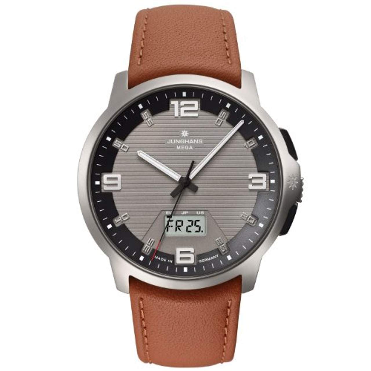 Junghans Voyager MF Herren-Funkuhr 056/2304.00Titan-Gehäuse mit Logo, Glasboden, Saphirglas, Sicherheitsschieber, wasserdicht bis 5 bar, Lederband, Dornschließe, Multifrequenz-Funkwerk J615.94 mit Autoscan, empfängt die Zeitsignale DCF77 (Europa), JJY40/JJY60 (Japan) und WWVB (USA), digitale Datumsanzeige in deutsch oder englisch, Stoppfunktion, mattierte Zeiger und Ziffern, Leuchtzeiger und Leuchtmarkierungen, zentraler Sekundenzeiger