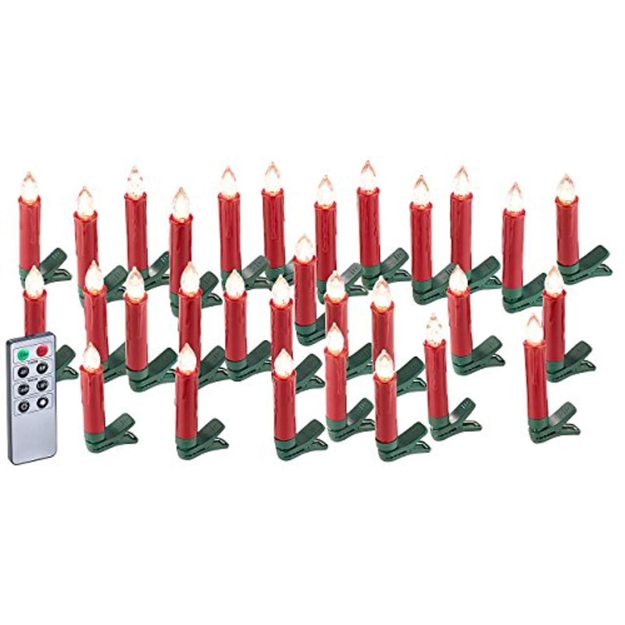Bei diesem Produkt handelt es sich um einen Satz von 30 LED-Weihnachtsbaumkerzen der Marke „Lunartec“. Sie werden mit einer Batterie betrieben und bieten zwei Modi: Kerzenflackern und Dauerlicht in 5 Helligkeitsstufen. Außerdem ist die Leuchtdauer auf 4 oder 8 Stunden einstellbar und es gibt grüne Krokodilklemmen zum Befestigen am Weihnachtsbaum. Jede Kerze ist 14 x 102 mm groß und wiegt 24 g (mit Batterie). Zum Lieferumfang gehören 3 Funkfernbedienungen und eine deutsche Anleitung.