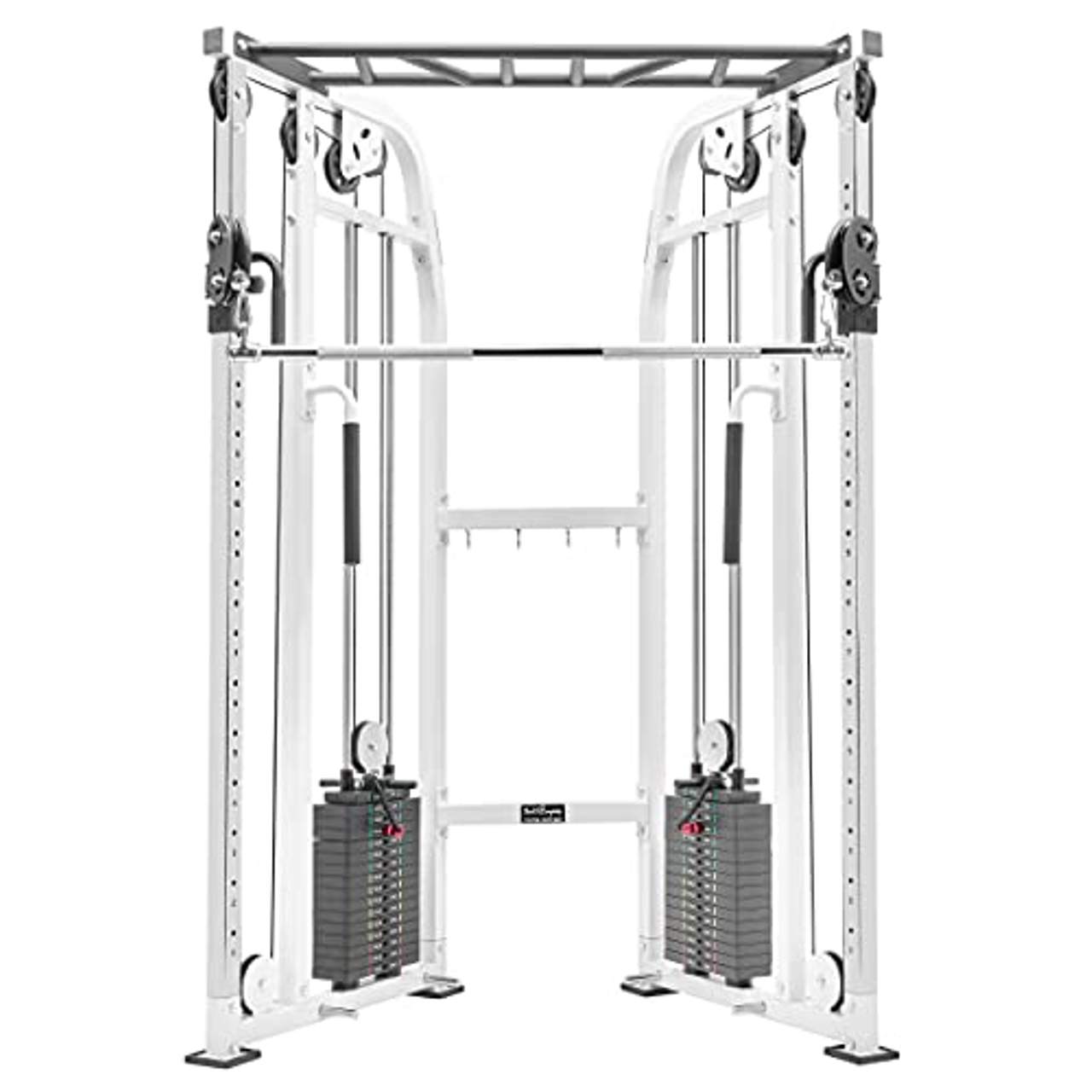 Im Lieferumfang ist umfangreiches Zubehör enthalten, z. B. zwei Trizeps-/Bizepsstangen, zwei Einhand-Kabelgriffe, vier Karabinerhaken, zwei 50 cm lange Verlängerungsketten aus Stahl und Stahlbefestigungsschrauben - das macht das Gerät vielseitig einsetzbar.