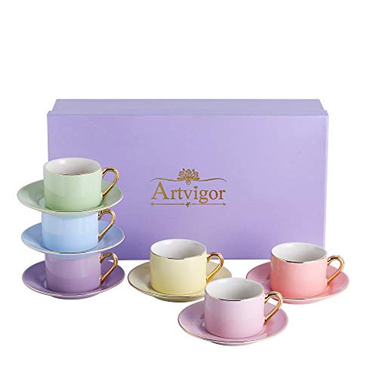 Artvigor 12 TLG Set Porzellan KaffeetassenEin edles Kaffeeservice in Geschenkverpackung, die erste Wahl als Geschenk für Weihnachten, Geburtstag und Hochzeit usw.Dieses fröhliche Kaffee-Geschirr erstrahlt in lebendigen Farbkombi. Es zaubert sowohl in der modernen Gastronomie als auch bei Ihnen zu Hause farbenprächtige Akzente auf den Tisch. Ob beim gemeinsamen Frühstück mit Freunden oder einfach einer schönen Tasse Kaffee zwischendurch - das farbenfrohe Porzellan setzt auf jeder Tafel ein Highlight, das Ihre Gäste begeistern wird!Das hochwertige Porzellan überzeugt durch Qualität und Widerstandsfähigkeit und ist daher wunderbar für den täglichen Gebrauch geeignet. Praktischerweise lassen sich die Tassen und Untertassen stapeln und somit platzsparend aufbewahren.· Größe: