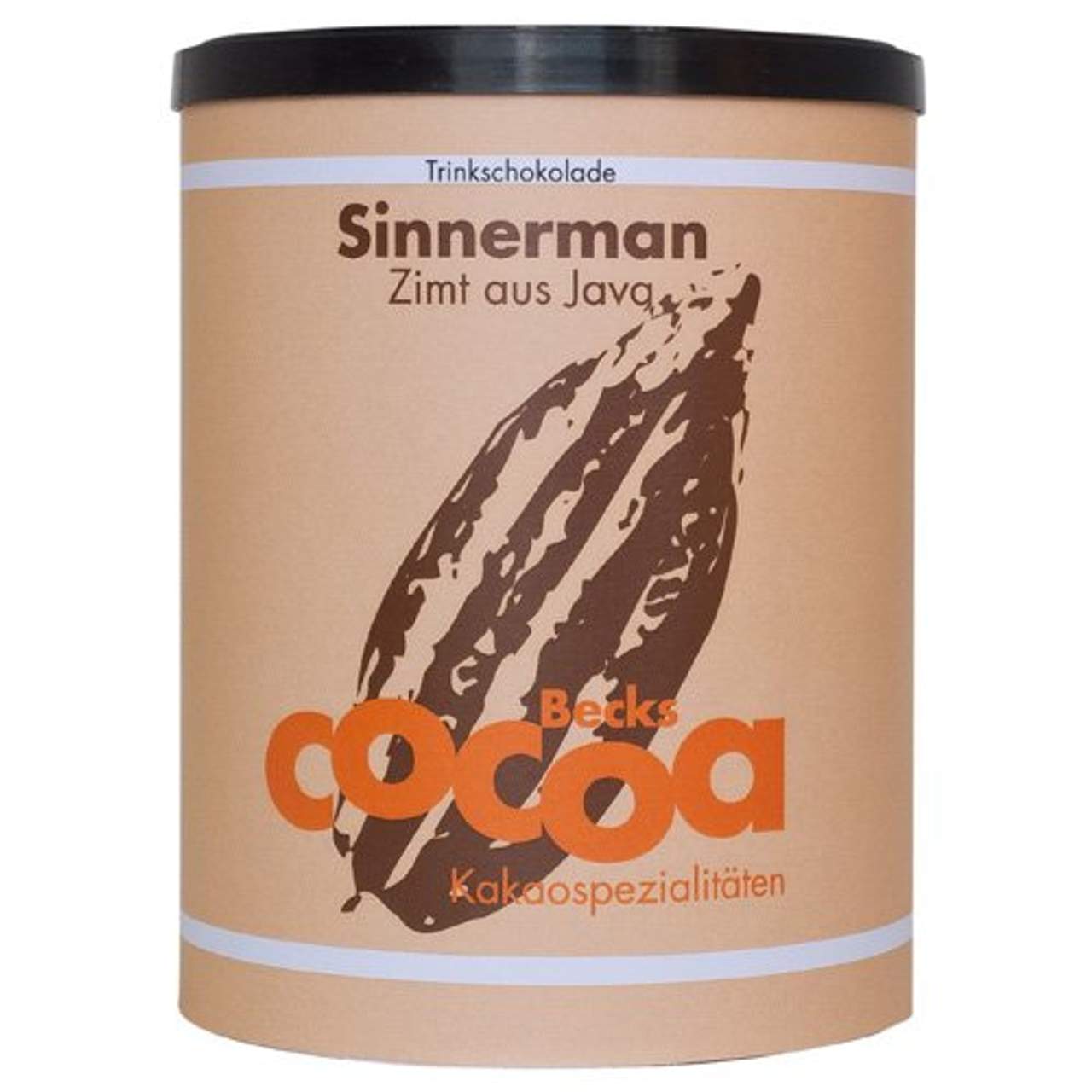 BecksCocoa Trinkschokolade Sinnerman Zimt Dose 250 g ist eine Trinkschokolade der Marke Beckscocoa. Sie enthält natürlichen Ceylon-Zimt, Kardamom und 50% Kakao. Das Produkt wird in einer wiederverschließbaren Dose geliefert und ist frei von Emugaltoren und künstlichen Zusatzstoffen. Die Nährwerte betragen 1580 kJ pro 100 g, 377 kcal, 10,7 g Fett (6,4 g gesättigte Fettsäuren), 52,6 g Kohlenhydrate (48,3 g Zucker), 9,9 g Eiweiß und 0,78 g Salz.