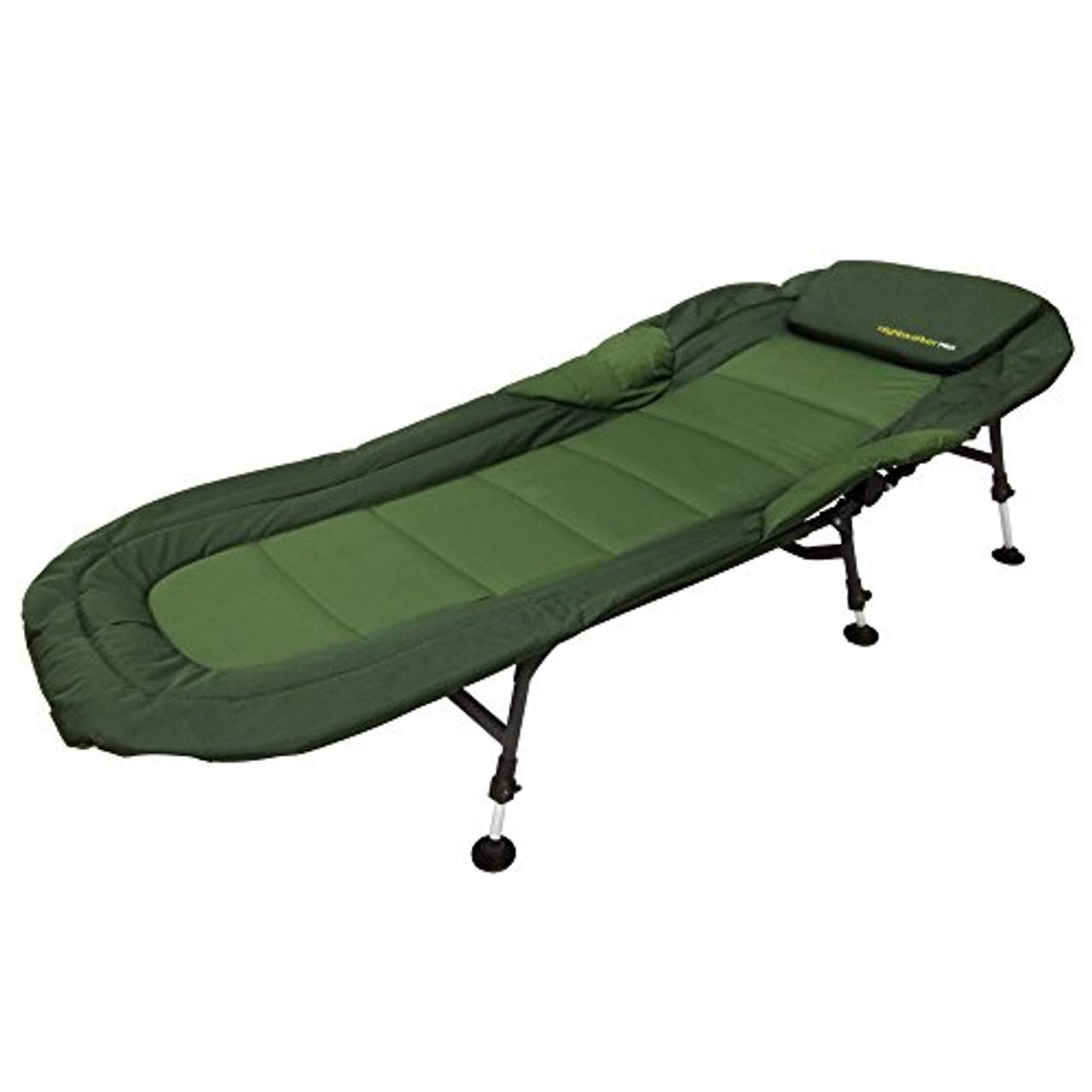 Neu aufgelegte, verbesserte Version Eingearbeites Komfortkissen Schlammfüße mit Kippgelenk passen sich jedem Untergrund an ThermopULsterung Superstabile 6- Bein Konstruktion Stufenlose Höhenverstellung der Beine Winkelverstellbares Kopfteil Geschützte GelenkeModerne Liege mit hohem Komfortfaktor - Angel Domäne Nightwalker Pro Comfort Bedchair