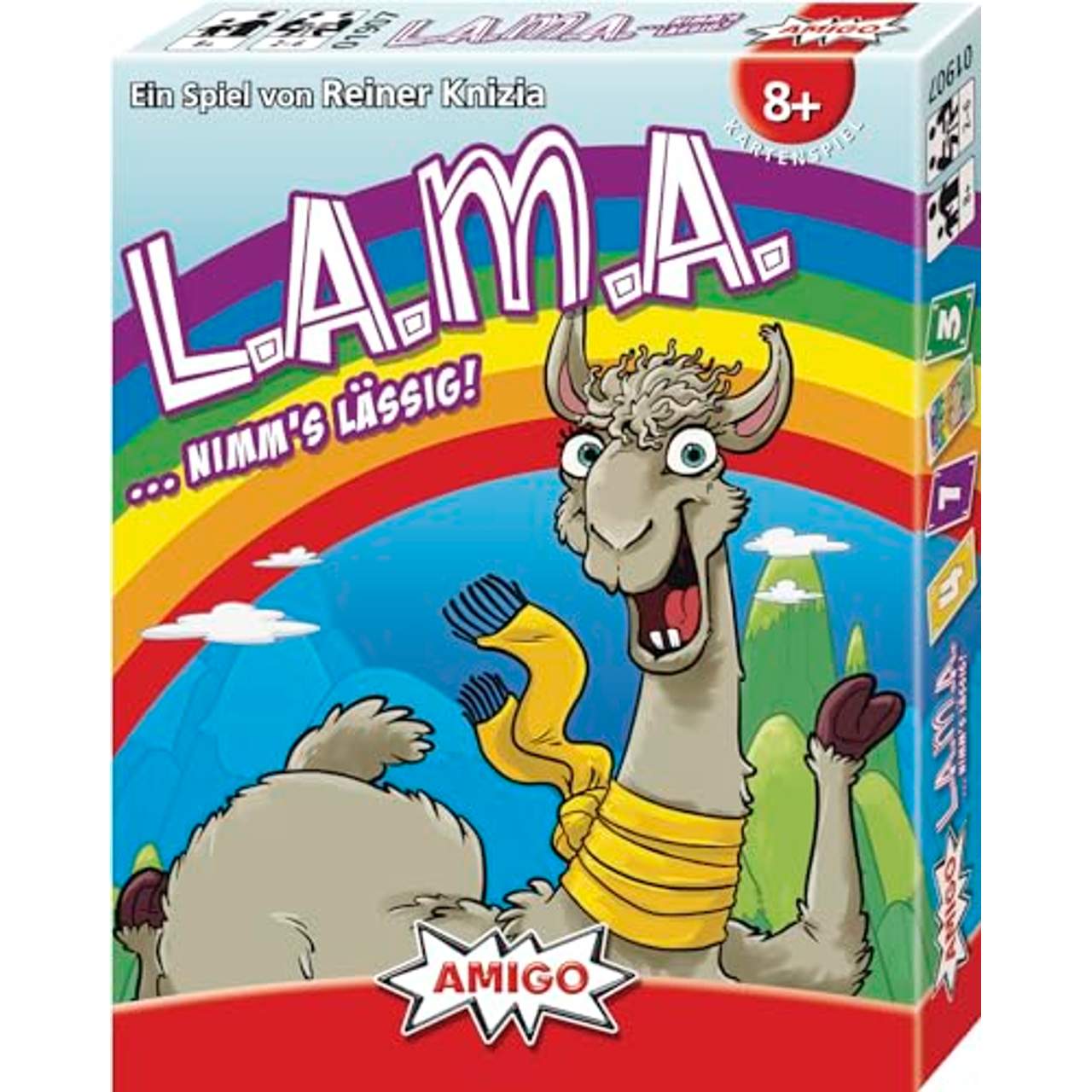AMIGO Spiel Freizeit Spielkarten 01907Lege Alle Minuspunkte Ab: Das ist das Prinzip, nach dem LAMA gespielt wird. Dazu müssen die regenbogenbunten Handkarten abgelegt werden, denn diese bringen fiese Chips. Die Karten müssen immer weiter auf der Regenbogenleiter gespielt werden. Mit einem Lama kann der Sprung von oben nach unten gemeistert werden.Dabei ist die Frage: Lohnt sich das Risiko, noch nach einer passenden Karten zu angeln oder sollte man doch lieber freiwillig aussteigen? Nur wer am lässigsten die Minuspunkte umgeht, kann Sieger sein.So spielt man LAMA:Die Karten werden gemischt und als Nachziehstapel in der Tischmitte platziert, eine Karte wird umgedreht und eröffnet den Ablagestapel.Die Karten zeigen Werte von 1 bis 6 sowie Lamas. Jeder Spieler erhält sechs Handkarten, die er so schnell wie möglich loswerden will, denn für übriggebliebene Handkarten drohen Minuspunkte: Jede Handkarte zählt ihren Wert als Minuspunkt, ein Lama zählt sogar 10 Minuspunkte, wobei jeder Wert nur einmal gezählt wird.Wenn ein Spieler am Zug ist, kann er eine aus drei Aktionen wählen:eine Karte ausspielen, eine Karte nachziehen oder aussteigen. Eine passende Handkarte ausspielen kann der Spieler, wenn die Karte denselben Wert oder genau einen Wert höher aufweist. Ein Lama kann auf eine 6 und auf ein Lama kann ein anderes Lama oder eine 1 gelegt werden. Kann oder möchte der Spieler keine Karte legen, nimmt er alternativ eine Karte vom verdeckten Nachziehstapel auf die Hand. Wem das Risiko einer unpassenden Karte zu hoch ist, darf aber auch aus der aktuellen Runde freiwillig aussteigen.Der Durchgang kann auf zwei Arten enden: Entweder hat ein Spieler alle seine Handkarten abgelegt oder alle Spieler sind freiwillig ausgestiegen. Die Minuspunkte werden in 1er und 10er Chips übergeben. Wer in der nächsten Runde als Erster seine Handkarten loswird, darf einen beliebigen Chip abgeben, das kann auch ein 10er-Chip sein.Das Spiel endet, wenn ein Spieler 40 Minuspunkte erreicht hat. Der Spieler mit den wenigsten Minuspunkten gewinnt.Kartenspiel von Erfolgsautor Reiner Knizia. Der Name ist Programm, denn jedes Lama kennt die wichtigste aller Regeln: Lege Alle Minuspunkte Ab!Dazu müssen die Spieler versuchen, alle ihre Karten loszuwerden, um möglichst keine Chips zu erhalten. Immer wieder müssen die Spieler neu entscheiden, ob sie freiwillig aussteigen oder hoffen, noch eine passende Karte zu ziehen. Am Ende gewinnt der Spieler, der am lässigsten den Minuspunkten ausweichen konnte.Ein kurzweiliges Kartenspiel mit Ärgerfaktor. Inhalt: 56 Spielkarten 70 Chips 1 SpielanleitungSpieler: 2–6 Personen Alter: ab 8 Jahren Dauer: ca. 20 Minuten