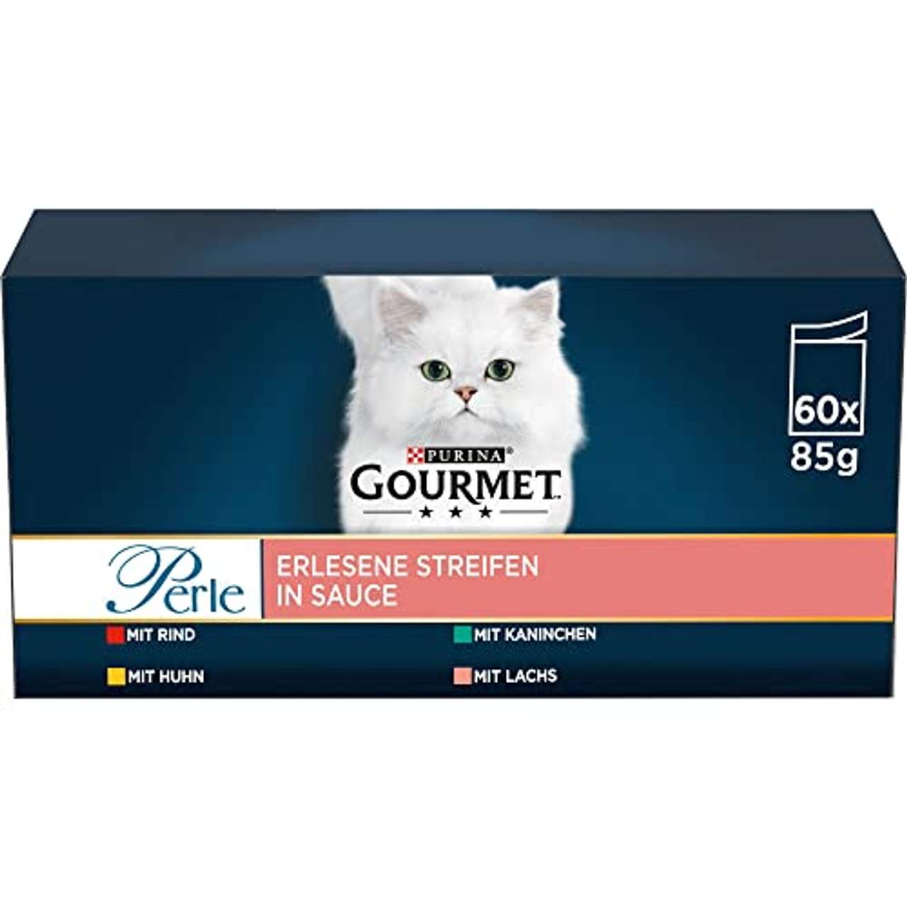 PURINA GOURMET Perle Erlesene Streifen Katzenfutter nass ist ein Nassfutter speziell für ausgewachsene Katzen. Es enthält Huhn, Rind, Lachs und Kaninchen in Sauce und wird in einem Multipack mit 60 Portionsbeuteln (60 x 85 g) geliefert. Das Produkt enthält keine künstlichen Farb-, Konservierungs- oder Aromastoffe und ist vollständig und ausgewogen, um den täglichen Bedarf Ihrer Katze zu decken. Die Fütterungsempfehlung liegt bei 3-4 Portionsbeuteln pro Tag, verteilt auf mindestens zwei Mahlzeiten. Es bietet ein unvergessliches Geschmackserlebnis, das Katzen lieben werden.