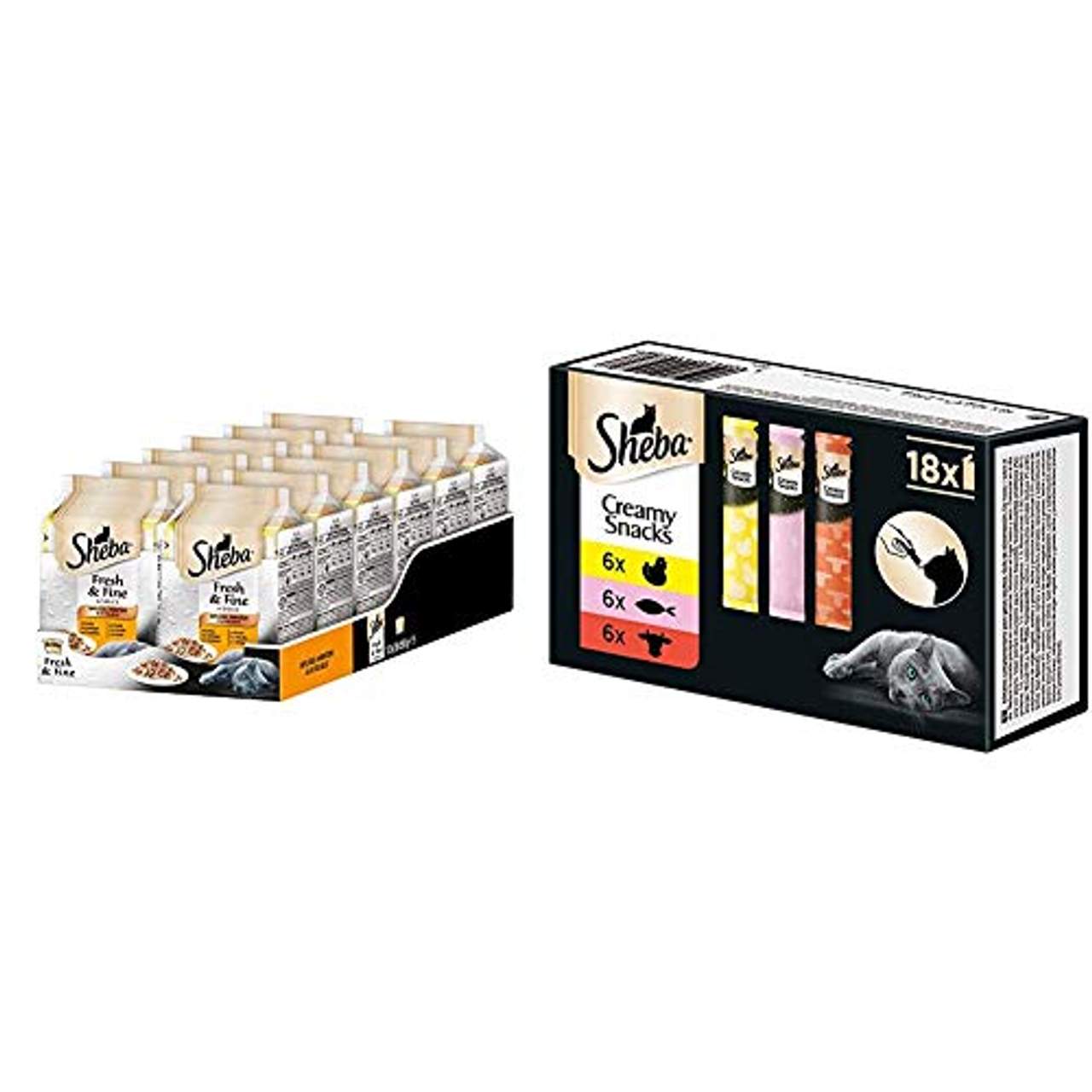 Sheba Fresh & Fine in Sauce ist eine Katzenfuttermarke, die sowohl Nass- als auch Trockenfutter anbietet. Das Nassfutter wird in 72 Beuteln zu 6 x 50 g in 3 Geschmacksrichtungen angeboten: Huhn, Truthahn und Geflügel, ohne Getreide. Eine 4 kg schwere Katze sollte 6 Beutel pro Tag oder 4 Beutel pro Tag plus 15 g Trockenfutter zu sich nehmen. Sheba Creamy Snacks werden auch als Leckerbissen in den Geschmacksrichtungen Huhn, Lachs und Rind angeboten. Jeder Beutel enthält 12 g Snacks, weniger als 10% der empfohlenen Kalorienzufuhr für Katzen und weniger als 3% Fett.