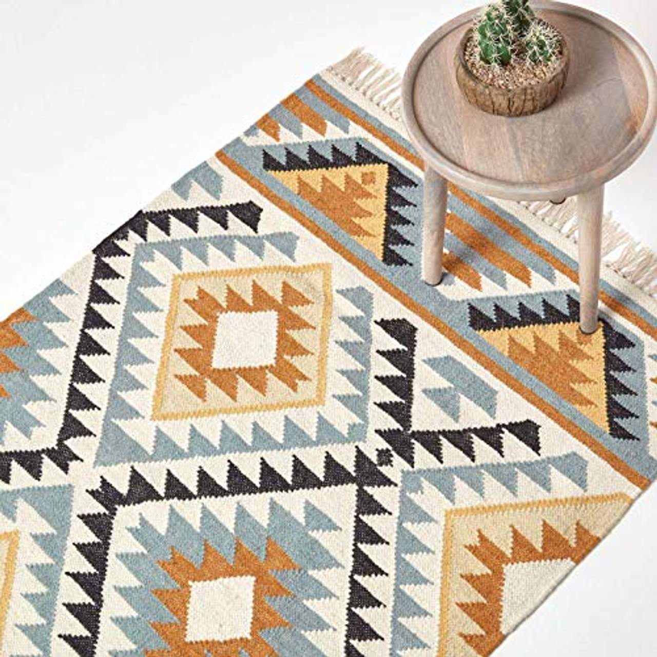 HOMESCAPES Kelim-Teppich Agra handgewebt aus WolleStilvoller Webteppich im Retro-StilDer flachgewebte Wollteppich Agra von Homescapes ist mit seinem geometrischen Muster, den trendigen Farben und charmanten Fransen ein absoluter Blickfang in jedem Raum - ob Wohnzimmer, Gästezimmer, Kindezimmer oder Esszimmer. Das Muster ist auf beiden Seiten gleich, wodurch der Vorleger regelmäßig umgedreht und auf beiden Seiten verwendet werden kann.Traditionelle indische Handwerkskunst für moderne WohnräumeDer Teppich ist an traditionellen Webstühlen in Indien per Hand gewebt, wodurch jedes Exemplar immer ein Unikat ist. Durch die dichte Webart und die Verwendung von qualitativ hochwertiger Wolle und Baumwolle wird die Langlebigkeit des Teppichs sichergestellt. Ein fairer Teil der Einnahmen aus dem Verkauf geht direkt an die Weber und ermöglicht so eine nachhaltige Herstellung zu fairen Bedingungen.Bitte beachten Sie, dass das Muster leicht vom Bild abweichen kann und bildschirmbedingte Farbabweichungen nie ganz ausgeschlossen werden können. Alle Maße sind ungefähre Angaben.Qualität direkt vom HerstellerWir bei Homescapes produzieren, importieren und vertreiben qualitativ hochwertige Heimtextilien, Wohnaccessoires und Haushaltswaren. In unserem Sortiment finden Sie sowohl trendige Einzelstücke, exklusive Bettwäsche-Kollektionen als auch stilvolle Möbelstücke. Wir verzichten auf Zwischenhändler und können durch unsere jahrelange Erfahrung im Haushaltswarengeschäft qualitativ hochwertige Produkte zu attraktiven Preisen anbieten.