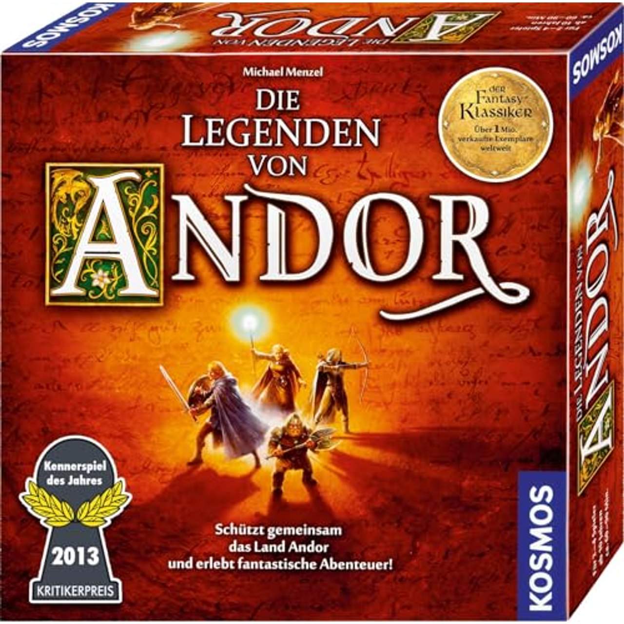 Die Legenden von Andor, Kennerspiel des Jahres 2013Die Legenden von Andor von KOSMOS ist das Kennerspiel des Jahres 2013. Schützt gemeinsam das Land Andor und erlebt fantastische Abenteuer! Das Land Andor ist in Gefahr. Feinde rücken aus den Wäldern und dem Gebirge auf die Burg des Königs zu.Nur eine kleine Heldengruppe stellt sich ihnen entgegen. Werden sie die Burg verteidigen können und gemeinsam gewinnen? Doch es warten noch weitere Abenteuer auf die Spieler. Die Hexe gilt es zu finden und den König zu den Schildzwergen zu eskortieren.In den Minen regt sich ein alter Feind. Und dann müssen die Helden auch noch gegen den wieder erwachten uralten Drachen antreten. Gemeinsam sind sie zwar stark, aber werden sie diese Herausforderungen bestehen? Das Kooperative Fantasy-Brettspiel.Ihr spielt gemeinsam gegen das Spiel Andor braucht euch! Das Land Andor ist in Gefahr. Aus den Wäldern und dem Gebirge rücken die Feinde auf die Burg des alten Königs Brandur zu. Nur eure Heldengruppe stellt sich ihnen entgegen.Wird euch die Verteidigung der Burg gelingen? Ihr schlüpft in die Rollen von Bogenschütze, Zauberer, Zwerg und Krieger und nutzt ihre unterschiedlichen Fähigkeiten bei der Rettung von Andor. Ihr habt die Wahl, ob ihr als Held oder Heldin die Legende erlebt.Abenteuerspiel mit leichtem Einstieg für die ganze Familie. > Detailreiches und atmosphärisches Spielmaterial. Ausgezeichnet mit dem „Graf Ludo“ als schönstes Familienspiel. > Grundspiel für 2–4 Spieler. Durch Ergänzungen sind 5–6 Spieler möglich. > „Die Legenden von Andor“ gehen weiter: Mit Ergänzungen weitere Helden spielen und mit Erweiterungen inneue Abenteuer und Geschichten eintauchen Das Spiel erschafft eine fantastische Welt, die die Spieler über fünf Legenden in Atem hält. Atmosphärisch dicht gestaltet mit opulenter Ausstattung und einfachem Regeleinstieg lädt „Die Legenden von Andor“ sofort zum Losspielen ein.Stück für Stück lernen die Spieler mehr Fähigkeiten dazu und müssen diese zur Lösung ihrer Aufgaben einsetzen. Nur wenn sie sich gut absprechen, haben sie eine Chance. Etwas Würfelglück darf im Kampf aber natürlich auch nicht fehlen.Dieses Strategiespiel garantiert eine lange abenteuerliche Reise voller Spaß und Spannung! Inhalt: 1 großer, beidseitig illustrierter Spielplan 72 Legendenkarten im Großformat 66 Ereigniskarten 40 illustrierte Spielfiguren als Stanzteile mit Aufstellfüßen 1 Erzähler-Figur 20 Würfel über 100 Kartonplättchen 9 Anzeigescheiben aus Holz 4 Anzeigesteine aus Holz 1 Legendenstein aus Holz 1 Spielregel 1 Almanach Auszeichnungen: „Kennerspiel des Jahres 2013“, „Spiele Hit 2013“, „Graf Ludo 2013“, „As D’Or 2013“ (Frankreich), „Winnar Experts 2014“ (Niederlande) und „Juego del Ano 2013“ (Spanien).