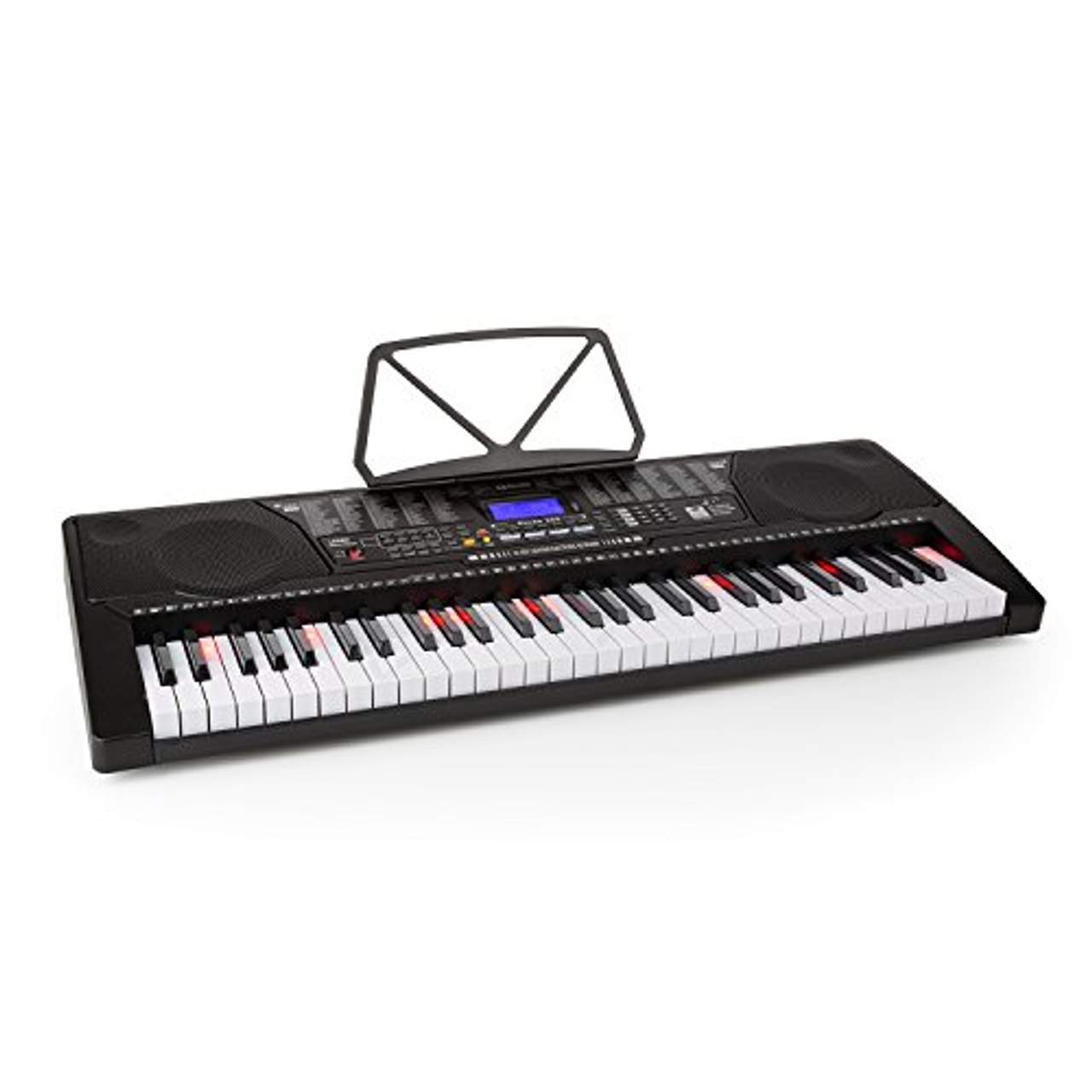 Schubert Etude 225 USB KeyboardEinsteigerfreundliches Keyboard mit 61 anschlagsempfindlichen Leuchttasten, 255 Stimmen, 255 Begleitrhythmen und 50 Demo-Songs. USB-Schnittstelle, AUX-IN, Kopfhörer- und Mikrofon-Anschluss sowie Aufnahme- und Playback-Funktion. : Intelligente Trainingsfunktion mit 3 Lernmodi und lichtgesteuerter Tastatur zum schrittweise Erlernen von Rhythmus und Melodie. : 255 Stimmen, 255 Rhythmen und 50 Demo-Songs sowie ein breitgefächertes Percussion-Pad bieten Nachwuchskünstlern einen großen Gestaltungsschatz, um die eigene Kreativität zu fördern. Zusätzlich erweitern Pitch-Bend und weitere, regelbare Effekte wie z.B. Sustain und Vibrato den Gestaltungsfreiraum.Nebst dem klassischen Erlernen der Noten vom Blatt bietet das Schubert: Etude 225: USB die Möglichkeit auf ganz intuitive Weise sich mit der Tastatur vertraut zu machen. Mit der intelligenten Trainingsfunktion werden in 3 aufeinander aufbauenden Lernmodi ausgewählte Stücke Note für Note erlernt. Geschult werden in einzelnen Schritte Töne, Melodie und Rhythmus, wobei die aufleuchtenden Tasten den Weg durch den Notenraum leiten. Zusätzliche Übungsstücke lassen sich dank der USB-Schnittstelle auf dem Keyboard abspielen.Ein sinnvolles Feature beim Skizzieren von Songideen oder dem Üben ist die integrierte Aufnahmefunktion. Die Split-Funktion unterteilt derweil die Klaviatur in Bass- und Melodiebereich, sodass auch zwei Personen in der selben Tonlage spielen können. Dies eignet sich insbesondere beim Musizieren mit einem Lehrer oder Partnerspieler Das Schubert:Etude 225: USB Lern-Keyboard : führt Einsteiger ganz intuitiv und ohne nötigen Vorkenntnisse in die schwarz-weiße Tastenwelt ein, wo Zwischentöne und Dissonanzen zu einem harmonischem Klangbild verschmelzen. Eigenschaften:: Anschlüsse: 1 x USB-Port, 1 x U-Disk-Port, 1 x Audio-IN, 1 x 3,5mm-Klinken-Mikrofon, 1 x 3,5mm-Klinken-Kopfhörer-Ausgang, LCD-Display, integrierte Stereolautsprecher, Lautsprechermetallschutzgitter, Master-Lautstärke, regelbare Rhythmus-Lautstärke, regelbare Akkord-Lautstärke, zuschaltbares Metronom mit 4 Tempi: 1/4, 2/4, 3/4 und 4/4, abschaltbare Anschlagdynamik, einstellbare Rhythmusgeschwindigkeit, Akkord-Funktion (Single Chord, Finger Chord, 4 Chord-Mats), Transpositions-Funktion (+/- 6 Stufen), Sustain-Effekt, Fine-Tuning-Funktion, Sync-Funktion, Pitch-Bend, Keyboard-Split, Vibrato-Funktion, Doppelton-Funktion, Begleitautomatik (Start/Stop, Fill-In, Tempo), Stromversorgung: DC 12 V / AC-Adapter, . Lieferumfang:: 1 x Keyboard, 1 x Notenständer (aufsteckbar), 1 x Netzstecker, deutschsprachige Bedienungsanleitung (weitere Sprachen: Englisch), . Abmessungen: : : Maße Keyboard: ca. 93 x 34 x 11 cm (BxHxT), Gewicht: ca. 4,5 kg, . Hersteller - Artikelnummer: 10031457