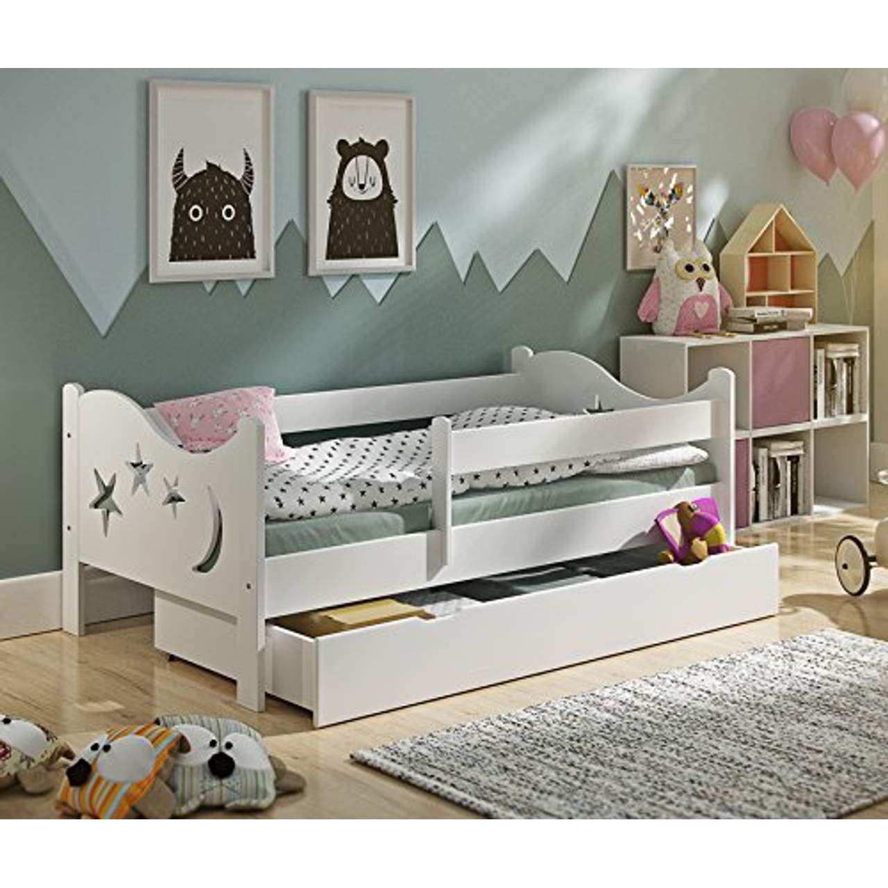 KATIDO Kinderbett Mond und SterneInkl. Lattenrost. Inkl. Matratze. Inkl. Schublade. Diese wünderschöne Bett aus Massivholz in Farbe weiß ist mit größter Sorgfalt und hoche Qualität für des Kindes gemacht. Sehr stabiler Bettrahmen aus Massivholz. Sicherheit für Ihr Kind dank Rausfallschutz (abnehmbar) und abgerundeten Kanten.Einfacher Zusammenbau. Montageanleitung und Beschlagteile inklusive. Alle verarbeiteten Teile entsprechen den EU Richtlinien. Für Kinder ab 1 Lebensjahr. Außenmassen: *Bett 140x70 - 145x75cm *Bett 160x80 - 165x85cm Gesamthöhe: 60cm