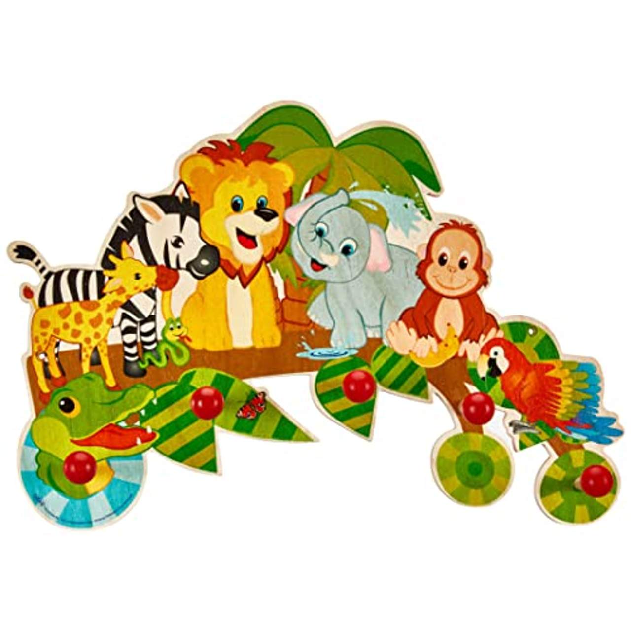 Hess Holzspielzeug 30305 Garderobe aus HolzHess Holzspielzeug - damit Kinderaugen strahlen! Diese farbenfrohe Kindergarderobe Dschungel aus Holz ist ein schöner Blickfang für das Kinderzimmer. Mütze, Schal und Jacke finden an den 5 Haken der ca. 40 x 24 cm großen Garderobe ihren Platz. Befestigungsmaterial (Schrauben und Dübel) ist im Lieferumfang nicht enthalten. - Motiv: Dschungel - Größe: ca. 40 x 24 cm - Kindergarderobe mit 5 Haken