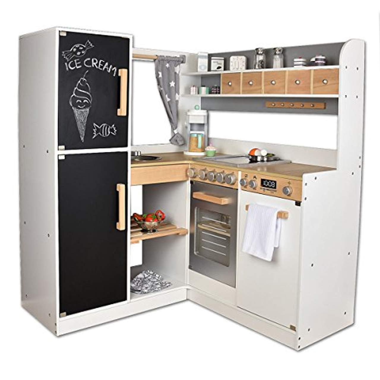 SUN Kinderküche Paris XXL aus HolzMit dieser großen Kinderküche aus Holz können Kinder ihr eigener Küchenchef sein. Ausgestattet mit vielen Details ist die Eck-Küche von SUN ein echter Hingucker in jedem Kinderzimmer. Weitere Eigenschaften: Große Kreidetafel am Kühlschrank Herausnehmbares Spülbecken für eine leichte Reinigung Wasserhahn Stoffvorhänge hinter dem Spülbecken viel Stauraum unter der Spüle Herd und Spülmaschine (Türen lassen sich öffnen und schließen) Vier Herdplatten Halterung für Küchenhelfer und fünf Schubladen Das abgebildete Zubehör gehört nicht mit zum Lieferumfang.
