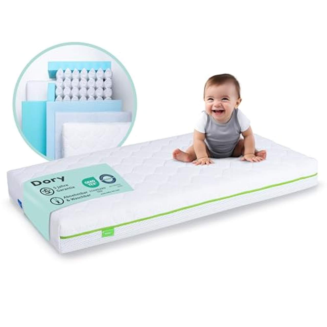 My Baby Mattress Babymatratze 60x120 cm Dory Sommer & WinterseiteINNOGEL GEDÄCHTNISSCHAUM Der Innogel-Memory-Schaum besteht aus Partikeln eines viskoelastischen Gels mit hoher Dichte von hoher Qualität. Das Gel bietet ein Gefühl der Frische, die länger als die gemeinsame visco beibehalten wird. POCKET-FEDER Die Federn sind unabhängig und durch einen Stoffbeutel miteinander verbunden.Die Atmungsaktivität ist sehr hoch, die Haltbarkeit ist länger als bei Bonellfederkernmatratzen, weil der Stoffbezug die Federn länger in der richtigen Position hält. Es verbessert die Ergonomie und reduziert Druckstellen. INNOGEL MEMORY-SCHAUMSTOFF Innogel besteht aus Gelpartikeln mit hoher Dichte.Diese sorgen für ein Gefühl der Frische, da die Wärmeaufnahme verzögert wird. So wird eine optimale Ruheumgebung geschaffen und Ihr Baby genießt einen erholsamen Schlaf. Der Memory-Schaum und die Taschenfedern passen sich perfekt an den Körper des Babys an.Schadstoffgeprüft / Zertifizierung nach EU Sicherheitsnorm DIN EN 16890 Hautfreundlicher Bezug abnehmbar und waschbar. Sommerseite / Winterseite / Erholsamer Schlaf / Feuchtigkeitsabführend / Wärmeregulierend Verwendung von hochwertigen Materialien. Weitere Hinweise OEKO Tex 100: Unsere gesamte Lieferkette unterliegt strengen Sicherheitsvorgaben.Selbst die verwendeten Fäden in der Produktion müssen diese Standards erfüllen. Der Memory-Schaum und die Taschenfedern passen sich perfekt an den Körper des Babys an.Hautfreundlicher Bezug abnehmbar und und kann bei 40°C gewaschen werden / Hergestellt in Spanien Sommerseite / Winterseite / Erholsamer Schlaf / Feuchtigkeitsabführend / Wärmeregulierend / mit Kantenverstärkung WENDEMATRATZE: Der Kern der Matratze ist für Neugeborene (0 - 8 kg) und Babys ab 8 kg geeignet - Verwendung von hochwertigen Materialien
