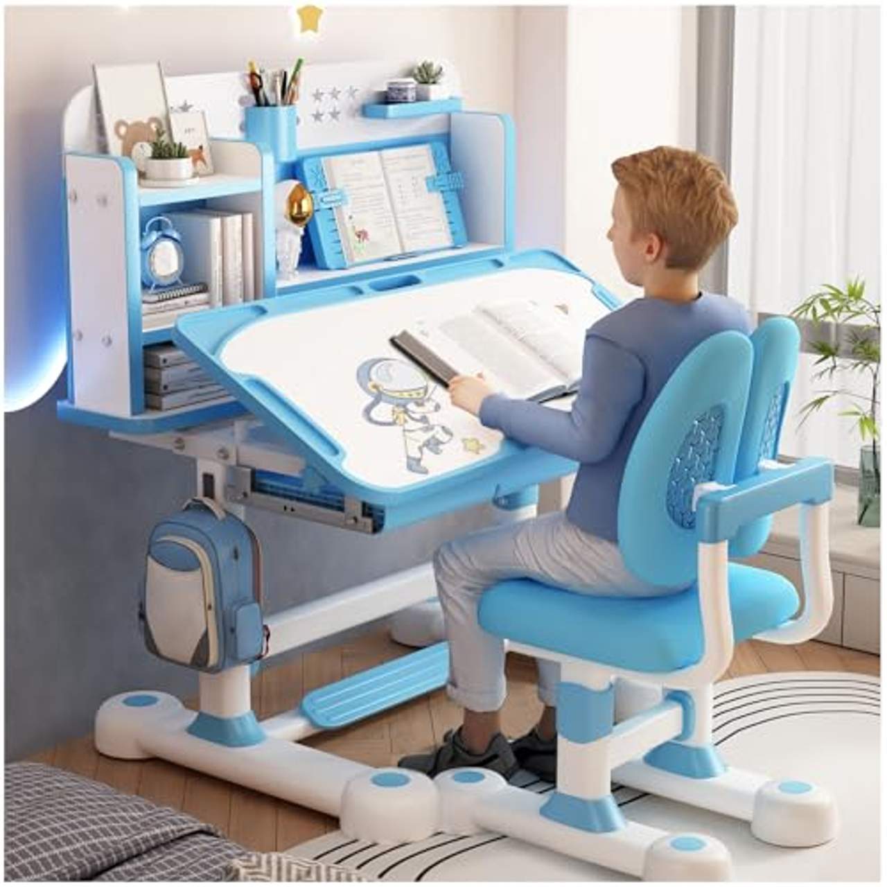 Dieser Schreibtisch wurde mit einer ergonomischen Struktur entwickelt, die sicherstellt, dass dein Kind beim Sitzen eine gute Haltung einnimmt. Er verfügt über einen stützenden Stuhl, der sich an die natürliche Krümmung der Wirbelsäule anpasst, sowie einen höhenverstellbaren Mechanismus, der eine bequeme Sitzposition ermöglicht und so zukünftigen Haltungsproblemen vorbeugt.