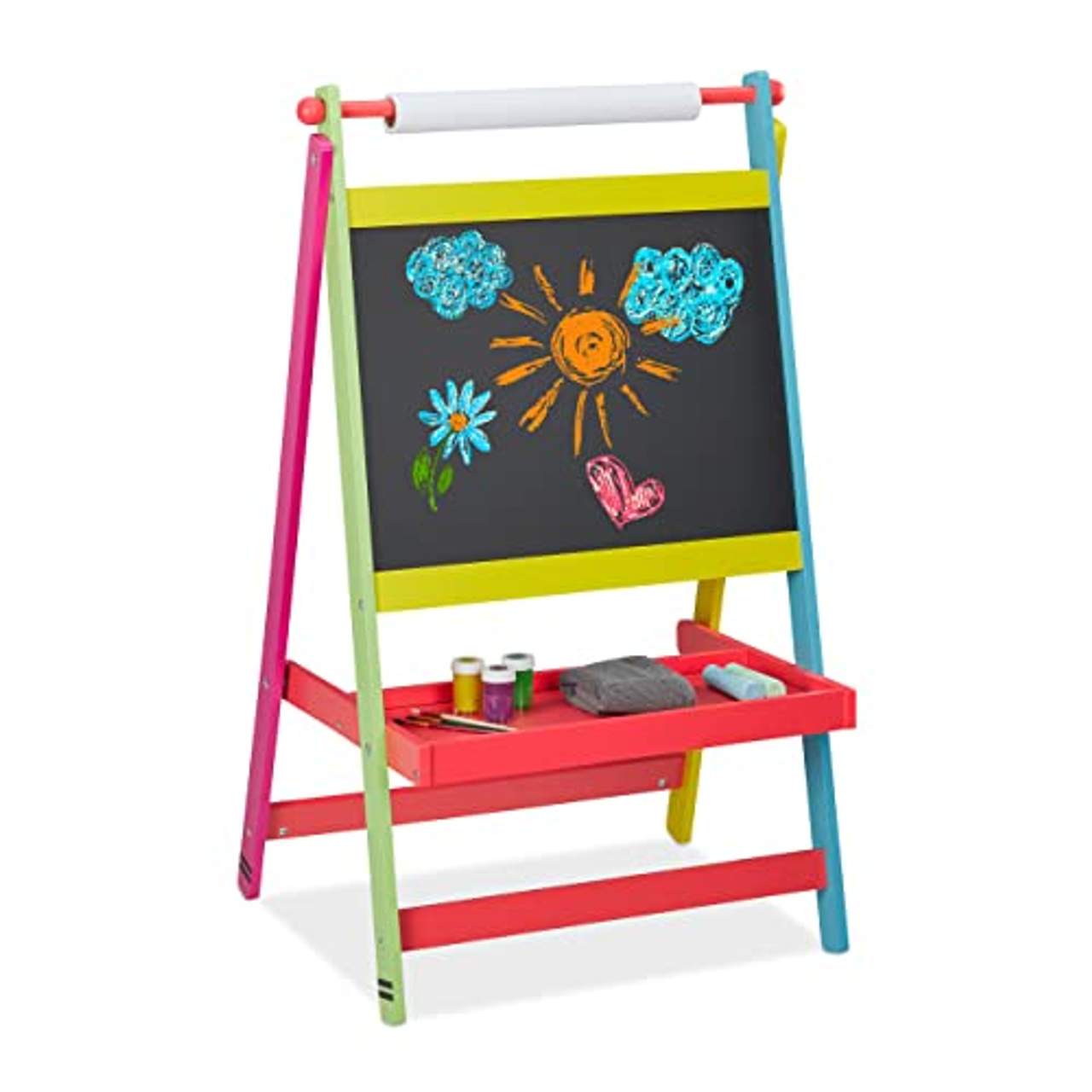Relaxdays Kindertafel 2 in 1Mit dieser Maltafel förderst Du die Kreativität Deiner Kinder, welche sich auf der großen Tafelfläche mit Kreide austoben können. Die Kindertafel bietet dank der Papierrolle den Picassos und Kahlos von Morgen die Möglichkeit mit Bunt- und Filzstiften, Wasser- und Fingermalfarbe Werke zu erschaffen, die nach Vollendung sogleich den Wänden zur Zierde dienen können.Das Künstler Zubehör verwahrt die Ablage griffbereit. Mit ihrem bunten Rahmen ist die Tafel ein Hingucker im Kinderzimmer.Die Tafel ist mit Papierrollen mit einem Innendurchmesser von mindestens 2 cm und mit einer Breite bis maximal 48 cm bestückbar.Kindertafel im Detail - Maße H x B x T: ca. 90 x 56 x 42 cm - Tafelfläche je H x B: ca. 34,5 x 48 cm - Papierrolle B x D: ca. 35 x 4 cm- Ablage innen H x B x T: ca. 2 x 45,5 x 20 cm- Gewicht Tafel: 3,8 kg - Material: MDF- Farbe: Schwarz, Rot, Gelb, Pink, Grün, BlauBunte Kreidetafel für Kinder- Tolle 2 in 1 Kombi aus Kreidetafel und abrollbarem Malpapier- Bereits mit einer Papierrolle bestückt zum sofortigem Loslegen- Praktische Ablage für Kreide, Buntstifte, Farben, Schwamm etc. - Kann kann frei im Raum platziert werden - Ohne Bohren- Regt spielerisch die Kreativität von Mädchen und Jungen an - Cooler Hingucker im Kinderzimmer dank mehrfarbigem GestellLieferumfang- 1x Tafel in Einzelteilen- 1x Papierrolle- Anleitung und Montagematerial- Dekorationsartikel sind im Lieferumfang nicht enthalten