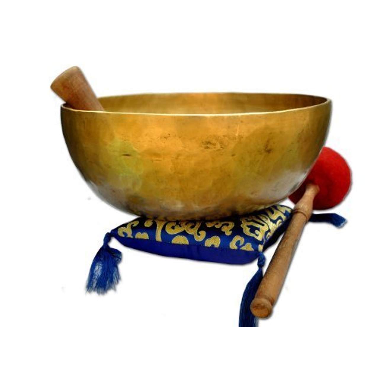 Diese Klangschale der Marke J M JEWELS wird in Nepal von erfahrenen Handwerkern handgefertigt. Sie hat einen Durchmesser von 27,9 cm, eine Höhe von 11,4 cm und wiegt etwa 2300 Gramm. Sowohl auf der Innen- als auch auf der Außenseite sind die bei der Herstellung entstandenen Hammerspuren zu sehen. Zum Lieferumfang gehören ein Holzschläger, ein Trommelstock und ein Seidenkissen.