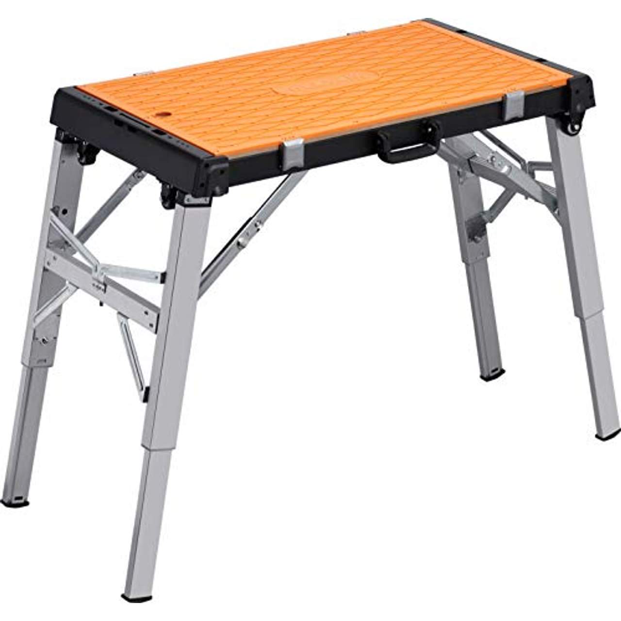 - Sicherer Stand: Der gerippte Kunststoffsockel bietet einen extrem sicheren Stand, wenn die Werkbank als Tritthocker oder Plattform für schwer zugängliche Stellen verwendet wird. Außerdem hat sie verstellbare Füße für zusätzliche Stabilität.