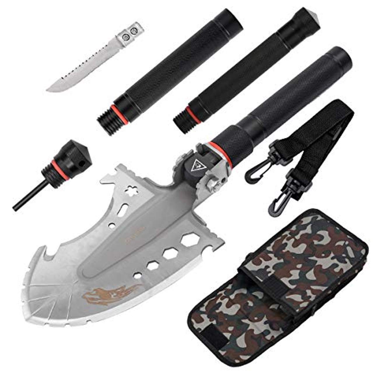 - Multifunktionaler Einsatz: Die ZITFRI Folding Spade Multifunktionsschaufel ist ein vielseitiges Werkzeug, das für viele verschiedene Aufgaben verwendet werden kann. Sie enthält Funktionen wie Schaufel, Pickel, Axt, Haken, Hammer, Feuerstarter, Fischmesser, Flaschenöffner, Selbstverteidigungsstock, Schraubenschlüssel und Jagdmesser. Damit ist es ideal für Gartenarbeit, Campingausflüge und andere Outdoor-Aktivitäten.