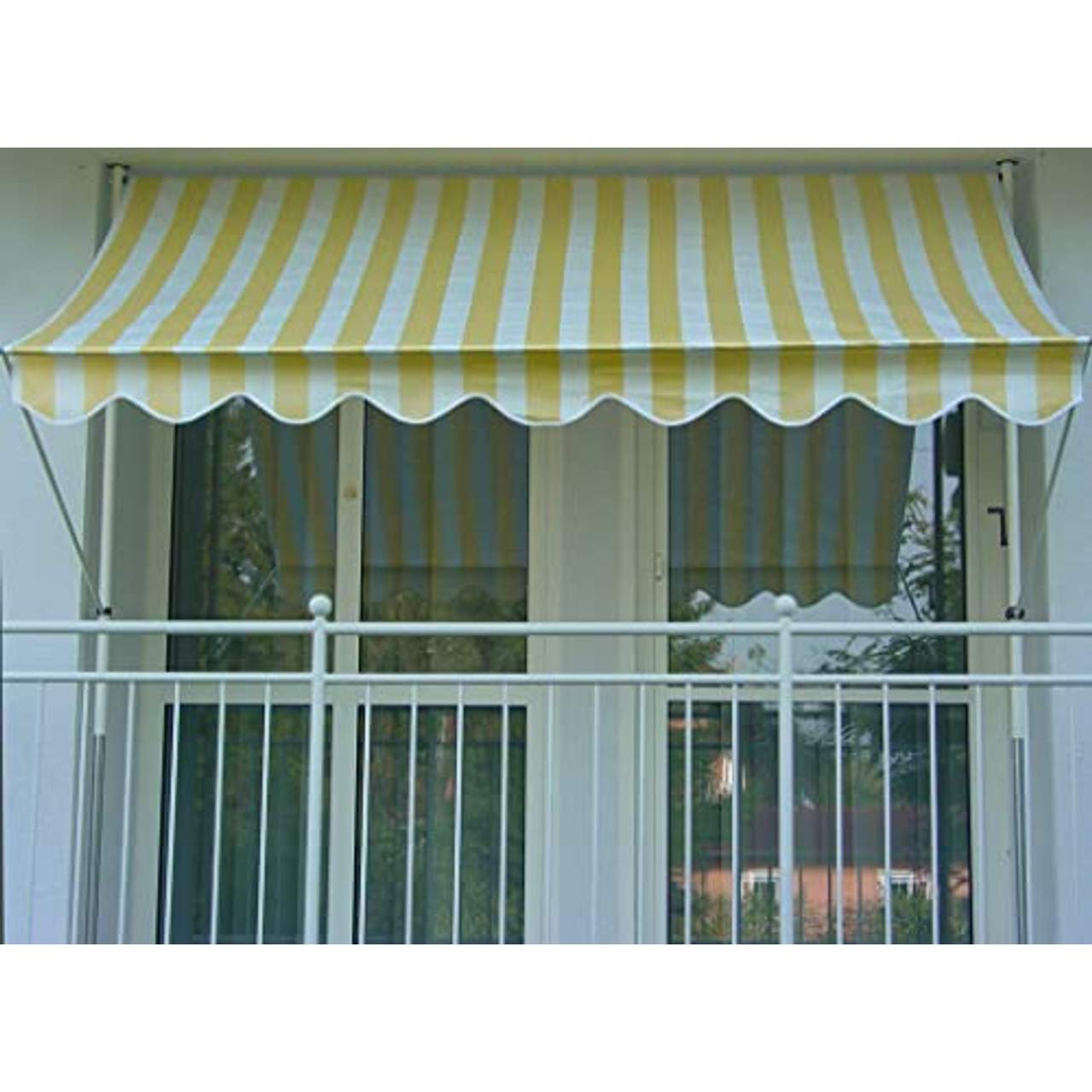 Angerer 2306/1002 Klemmmarkise PE-Gewebe BlockstreifenDie Angerer Klemmmarkise mit gelb-weiß gestreiftem Bezugstoff wird ganz einfach durch Einklemmen zwischen Boden und Decke montiert, ohne lästiges Bohren und Dübeln. Sie lässt sich vollkommen rückstandslos demontieren und ist somit ideal für Mietwohnungen geeignet. Stufenlos Einstellbar Die Einbauhöhe ist von 225 bis 275 cm stufenlos verstellbar.Der Bezug besteht zu 100% aus Polyethylen (200 gr/m²). Das Kunststoffgewebe ist wasser- und schmutzabweisend beschichtet und abwischbar. Einfaches Ein- & Ausfahren Das Tuch kann bis maximal 150 cm ausgerollt und in der gewünschten Position festgestellt werden. Ein im Klemmpfosten verborgener Kettenantrieb lässt die Markise leichtgängig ein- und ausfahren. Die Kurbel ist wahlweise links oder rechts montierbar.Die angegebene Breite bezieht sich auf die Gesamteinbaubreite der kompletten Markise, inklusive Gestänge (von Außenkante zu Außenkante gemessen). Stabiles Grundgerüst Das Gestell in der Farbe weiß besteht aus verzinktem und pulverbeschichtetem Stahl.