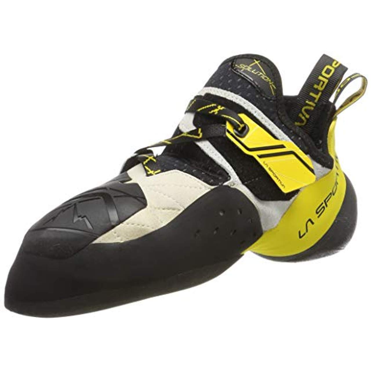 LA SPORTIVA Unisex-Erwachsene 20g000100 KletterschuheHigh-End Qualität von La Sportiva im neuen Design: Die Solution Kletterschuhe erfreuen sich seit geraumer Zeit enormer Beliebtheit unter Boulderern und Sportkletterern - und das zu Recht! Mit seiner revolutionären Form, der enganliegenden Gummischale, sitzt der Solution wie eine zweite Haut, was extreme Präzision beim Setzen von Hooks und kleinsten Tritten erlaubt. Spezielle Toe-Hook Aufsätze erzeugen maximale Reibung, die ungewolltes Rausschwingen aus dem Dach schier unmöglich macht.In die Gegenrichtung, bei Heelhooks, bringt die Lock Harness Konstruktion um den Knöchel extra Unterstützung und Spannung auf die Ferse. Zwischen den Versuchen lassen sich die Solution Kletterschuhe easy und schnell aus- und wieder anziehen, ohne großes Suchen nach dem richtigen Sitz:Das patentierte fast lacing System macht’s möglich und verbindet Schnürung mit Klettverschluss. Einmal ziehen, den Klett schließen und das Ding sitzt bei jedem Versuch unverändert und bombenfest. Die absolute Waffe für technische, präzise Kletterei! Zum Testbericht: „Solution Kletterschuhe“ im Bergzeit Magazin.