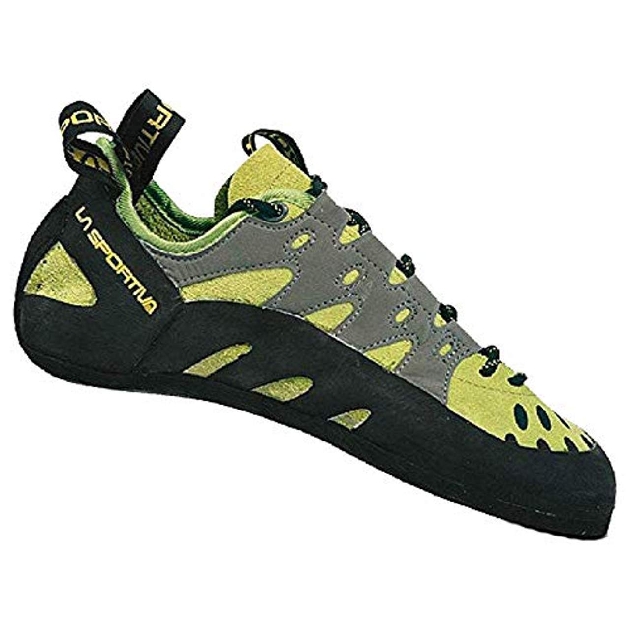 LA SPORTIVA Unisex-Erwachsene Tarantulace KletterschuheDer Tarantulace Men von La Sportiva ist ein bequemer Kletterschuh geeignet für Anfänger in der Kletterhalle. Das Obermaterial ist aus robustem Suede mit einem Schaft aus Sämischleder. Das flink laufende Schnürsystem ermöglicht eine komfortable Anpassung und trägt zur Schuhstruktur bei.Die Schuhzunge aus schweißabweisendem Material besteht aus zwei überlagerten Schichten, so wird die Passform erleichtert und eine Faltenbildung verhindert. Die Außensohle FriXion RS mit 4 mm garantiert maximale Langlebigkeit. Die neutrale, mittlere Passform des Tarantulace Men von La Sportiva eignet sich für die meisten Fußtypen.