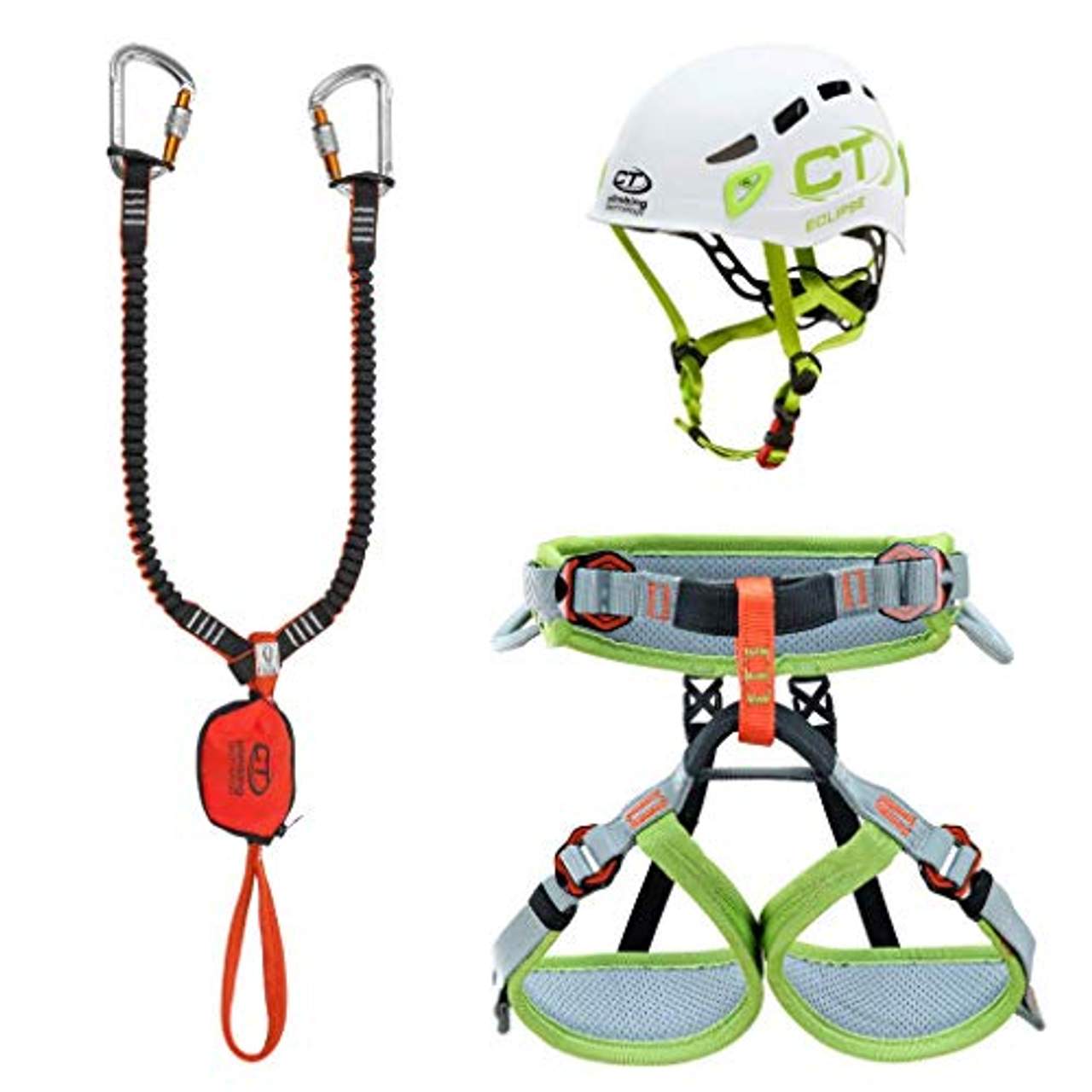 Das Climbing Technology Junior Eclipse-Classic-k Slider-Ascent Set enthält drei wesentliche Komponenten: den Eclipse Helm, das Classic-k Slider Ferrata Set und den Ascent XXS Karabiner.