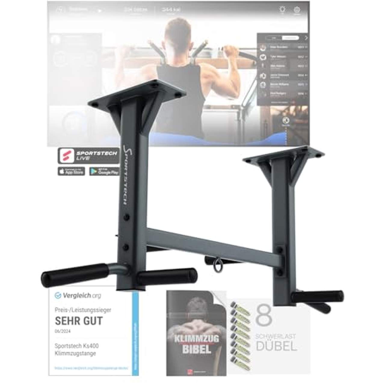 Sportstech 4in1 Klimmzugstange KS400Sportstech 4in1 Klimmzugstange KS400 Deckenmontage, 3 Ösen für TRX, Boxsack, 6 Rutschfeste Griffe, extrem stabil, unzählige Pull Up Übungen inkl. eBook, Deckenhalterung, 8 Schwerlastdübel zur Montage. Mit wenig Platz zu vielen Muskeln. Das Training an einer Klimmzugstange ist unglaublich vielseitig. Neben dem herkömmlichen Klimmzug, bei dem schon extrem viele Muskel auf einmal zum Einsatz kommen, können Sie auch diverse Bein- und Bauchübungen an ihr durchführen.Aber da, uns von Sportstech, das an Vielseitigkeit noch nicht reicht, haben wir die KS400 so gebaut, dass Sie mit ihr Ihren Trainingsplan durch unzählig viele Übungen erweitern können. Die KS400 Klimmzugstange für die Decke hat im Gegensatz zu herkömmlichen Dip Deckenhalterungen 3 Ösen, um zusätzliches Equipment für Ihre Übungen aufzuhängen: etwa einen Boxsack, oder Ringe für Power Ropes, TRX-Bänder oder Schlingen. Aus 1 Gerät werden so schnell und einfach 4 Trainingsgeräte. Wir haben die KS400 Klimmzugstange mit Deckenbefestigung extrem stabil gebaut. Doppelte Verstrebungen am Fuß sorgen für dauerhaften Halt. Extra breite Auflageflächen verteilen die auftretenden Kräfte bestmöglich in 4 Richtungen. Damit die Klimmzugstange noch belastbarer ist, haben wir sie zusätzlich mit Querverstrebungen versehen. Die Schwerlastdübel sind für Beton und Stahlbeton Mauerwerk geeignet. Nur bei Wänden aus Poroton bestehen Einschränkungen. Dieses Set sorgt dafür, dass die Klimmzugstange immer in der von Ihnen ausgesuchten Position bleibt.