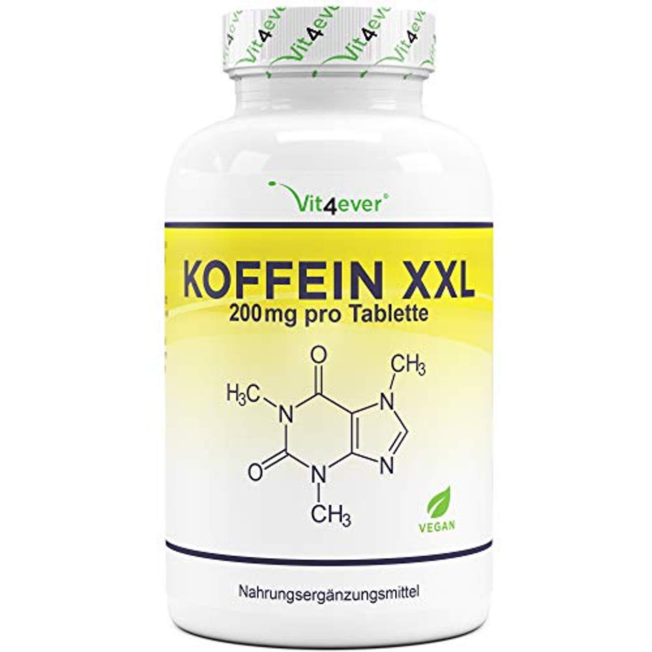 Vit4ever Koffein TablettenKoffein im Detail Koffein ist ein Alkaloid, welches in natürlicher Form in verschiedenen Pflanzen, wie Kaffeebohnen, Kakaofrüchten oder Blättern von Teesträuchern vorkommt. Den Pflanzen dient Koffein als Abwehr gegen Schädlinge. Beim Menschen wirkt die psychoaktive Substanz stimulierend auf das zentrale Nervensystem.Highlights auf einen Blick: 500 hochdosierte Koffeintabletten pro Dose. Jede Tablette enthält 200 mg Koffein Schnelle Wirkung (ca. 30 Minuten nach Einnahme der Tabletten) & leichte Anwendung durch eine angenehme Tablettengröße Eine Kapsel oder Tablette mit Koffein hat 200 mg, ein Becherkaffee mit 200 ml hat ca. 80 mg, ein Energy Drink mit 250 ml ca. 80 mg, eine Tasse Grüner Tee mit 200 ml ca. 50 mg & eine Flasche oder Dose Cola mit 330 ml hat ca. 33 mg Coffein Unsere Koffein Tabletten sind zu 100% vegan & frei Gelatine, Aromen, Farbstoffen, Stabilisatoren, Konservierungsstoffen und selbstverständlich laktosefrei & glutenfrei Vit4ever Koffein Tabletten im Detail Die Koffeintabletten von Vit4ever enthalten 200 mg hochdosiertes Koffein pro Tablette. Der Koffeingehalt einer Tablette entspricht etwa dem Koffeingehalt von 2 Tassenkaffee. Die Tabletten enthalten 200 mg wasserfreies, hochkonzentriertes Koffein, sind vegan und angenehm einzunehmen. Sie geben ihre Wirkung schnell frei (ca. 30 Minuten nach Einnahme der Tabletten). Vit4ever Produktqualität Die Koffein Tabletten werden nach europäischen Qualitätsstandards (DIN EN ISO 9001 und HACCP-Konzept) hergestellt und wie bei allen Nahrungsergänzungsmitteln von Vit4ever, legen wir stets großen Wert darauf, dass bei der Produktion ausschließlich Premium Rohstoffe verwendet werden.Die Koffeintabletten sind 100 % vegan, gelatinefrei, frei von Aromen, frei von Farbstoffen, frei von Stabilisatoren, laktosefrei, glutenfrei, frei von Konservierungsstoffen & natürlich frei von gentechnikveränderten Zutaten (GMO frei).