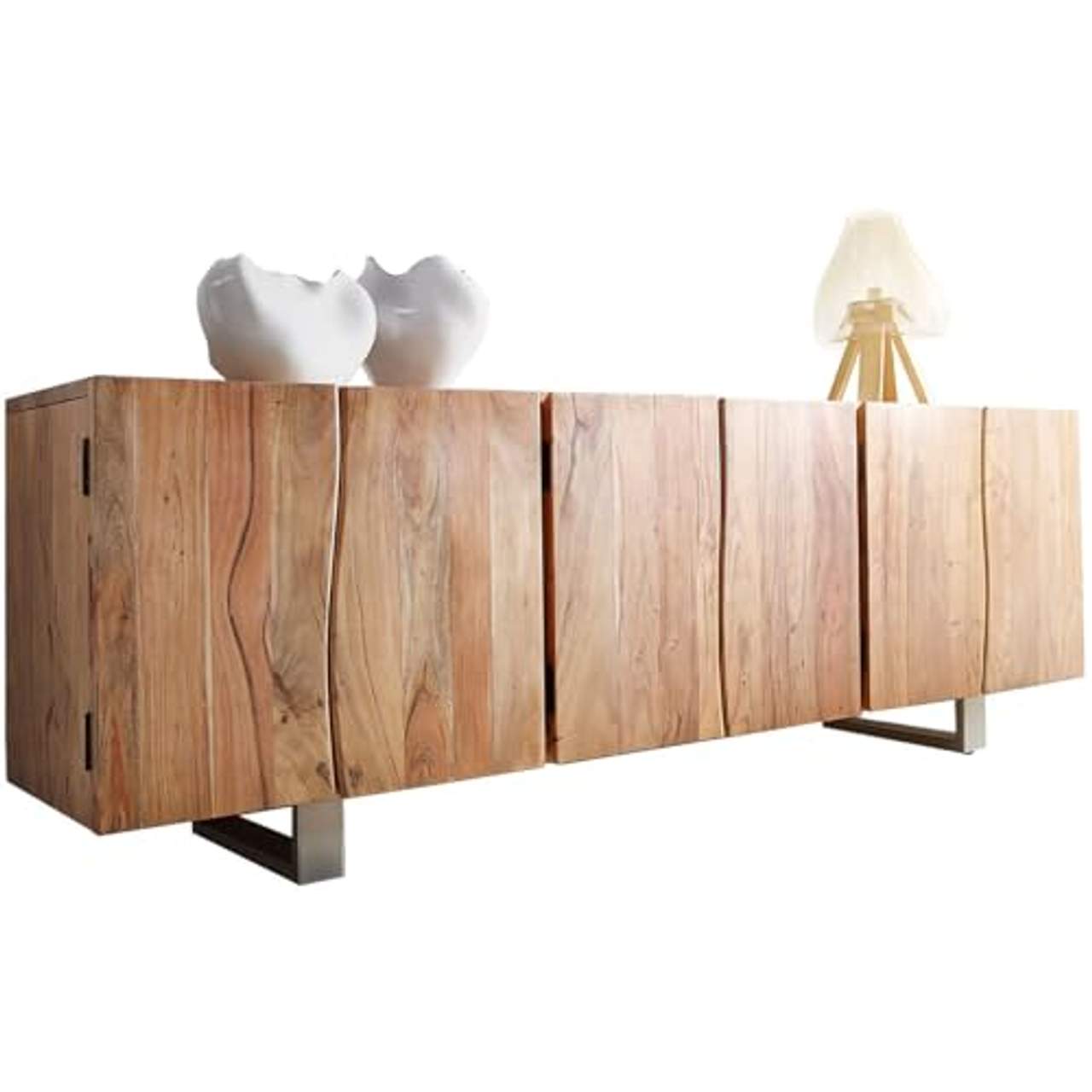 DELIFE Kommode Live-Edge Akazie NaturDie Kommode Live-Edge eignet sich aufgrund ihres minimalistischen Formdesigns als Möbelstück für verschiedene Räume. Wie eine klassische Anrichte bietet diese Massivholzkommode aus naturfarbenem Akazienholz auf der Oberseite viel Abstellfläche für Dekorationsgegenstände und andere Dinge. Ein praktisches Sideboard mit Stil Dieses Einrichtungselement kann exzellent als Buffet verwendet werden, da es in seinem Inneren hinter den drei Türen viel Stauraum bietet.Optisch stechen sofort die geschwungenen Baumkanten an den Türen ins Auge, die in einem angenehm spannungsgeladenen Widerspruch zu den kantigen Edelstahlfüßen stehen.Maße ca.: B220 x T46 x H75 cmMaße je Fach: B70 x T40 x H25 cm Maße Füße: B41 x T2,5 x H13 cmMaterial: Akazienholz, EdelstahlFarbe: Natur, SilberOberfläche: LackiertMontagehinweis: teilmontiert, die Füße müssen montiert werdenGewicht in kg: 89Hinweis: die Füße können in zwei verschiedenen Abständen montiert werden, jedes Möbelstück ist ein Unikat und kann in Materialstärke, Form und Maß abweichen, die Fronten können, aufgrund der unregelmäßigen Form, an einigen Stellen um mehrere Zentimeter variieren, auch natürliche Einschlüsse, Astlöcher oder Unregelmäßigkeiten im Material sind natürlichen Ursprungs,