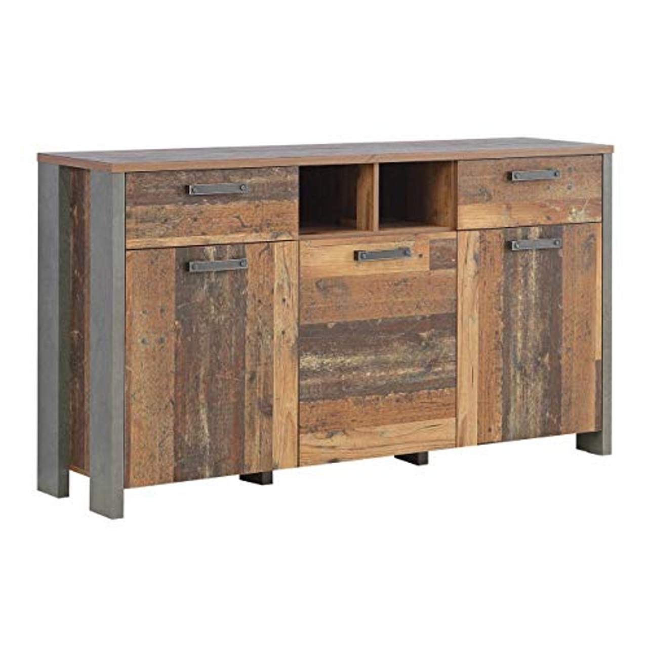 Forte Clif Kommode mit 3 Türen und 2 SchubkästenSideboard mit Schubkästen Cleo 3-türigModernes Design und die trendige Kombination von Old Wood Vintage und dunkler Betonoptik! Die Serie „Cleo“ verspricht nicht nur optische Highlights, sondern auch eine solide Verarbeitung und Langlebigkeit. Sie strahlt Wärme und Natürlichkeit aus, was Ihr Zuhause einladend und gemütlich wirken lässt. Gerade die dunkle Holz-Optik ist nicht nur angesagt, sondern auch leicht zu kombinieren. „Cleo“ bietet verschiedene Möbelstücke für den Eingangsbereich, das Schlafzimmer, Jugendzimmer und den Wohnbereich. Für jede Menge Stauraum sorgen verschiedenen Kommoden und Sideboards. Holen Sie sich frischen Wind in Ihr Zuhause! Dieses tolle Sideboard ist ein kleines Schmuckstück. Es bietet jede Menge Platz für all Ihre Wohn-Utensilien. Für übersichtliches einordnen sorgen Schubkästen, in denen Kleinigkeiten ihren Platz finden. Hinter drei Türe lassen sich die Dinge verstauen, die nicht sofort sichtbar sein sollen. Passende Metallgriffe in Schwarz vervollständigen den modernen look. Weitere Möbelstücke der Serie „Cleo“ finden Sie über den Link unter der Produktbeschreibung.Farbausführung: Old Wood Vintage / Betonoptik dunkelgrau1x Sideboard Cleo